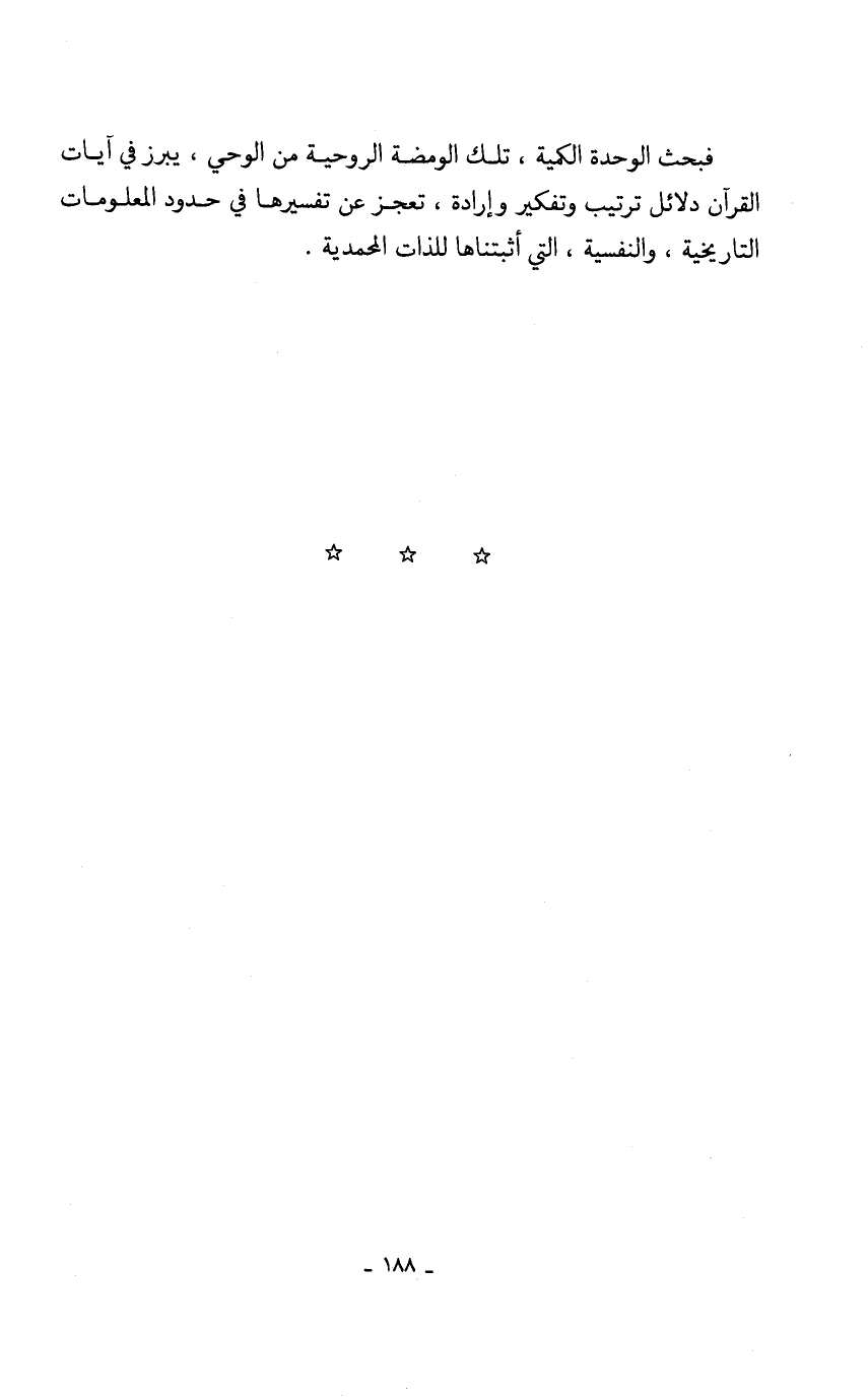 فبحث الوحدة الكمية، تلك الومضة الروحية من الوحي، يبرز في آيات القرآن دلائل ترتيب وتفكير وإرادة، تعجز عن تفسيرها في حدود المعلومات التاريخية، والنفسية، التي أثبتناها للذات المحمدية.