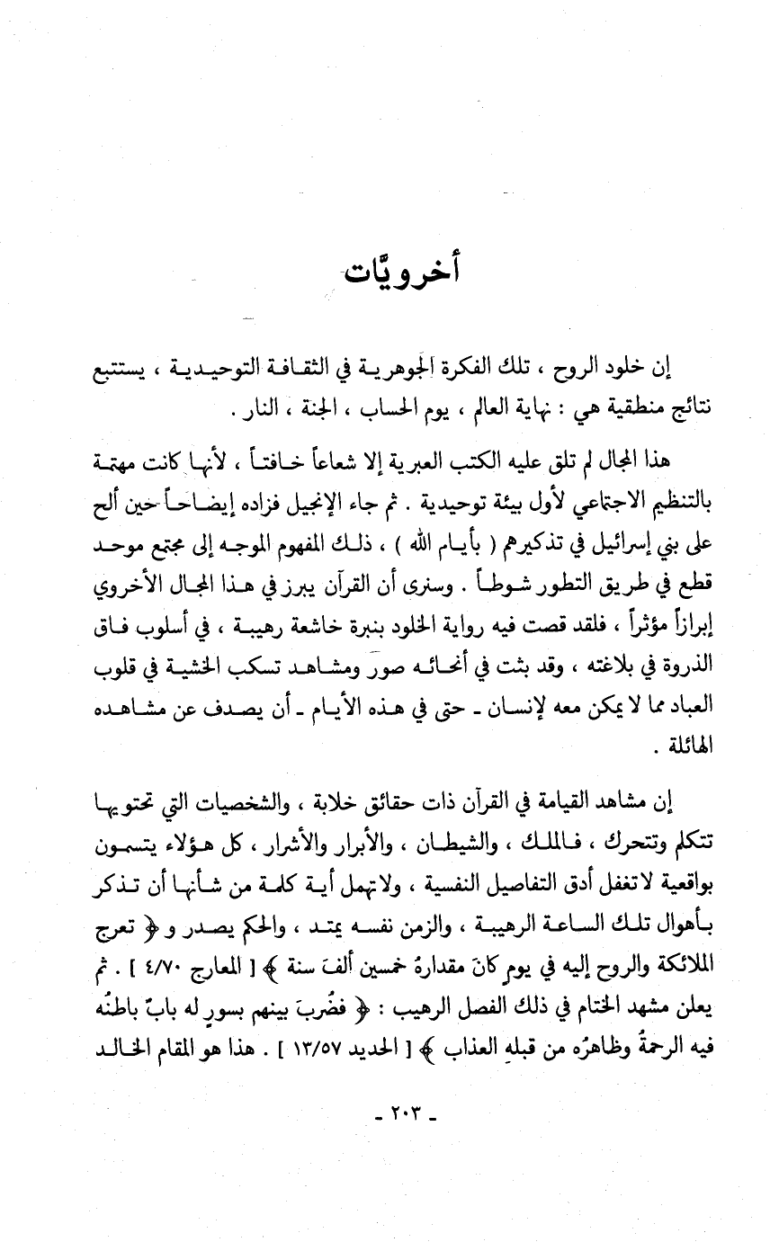 هذا المجال لم تلق عليه الكتب العبرية إلا شعاعاً خافتاً، لأنها كانت مهتمة بالتنظيم الاجتماعي لأول بيئة توحيدية. ثم جاء الإنجيل فزاده إيضاحاً حين ألح على بني إسرائيل في تذكيرهم (بأيام الله)، ذلك المفهوم الموجه إلى مجتمع موحد قطع في طريق التطور شوطاً. وسنرى أن القرآن يبرز في هذا المجال الأخروي إبرازاً مؤثرا، فلقد قصت فيه رواية الخلود بنبرة خاشعة رهيبة، في أسلوب فاق الذروة في بلاغته، وقد بثت في أنحائه صور ومشاهد تسكب الخشية في قلوب العباد مما لا يمكن معه لإنسان- حتى في هذه الأيام- أن يصدف عن مشاهده الهائلة.