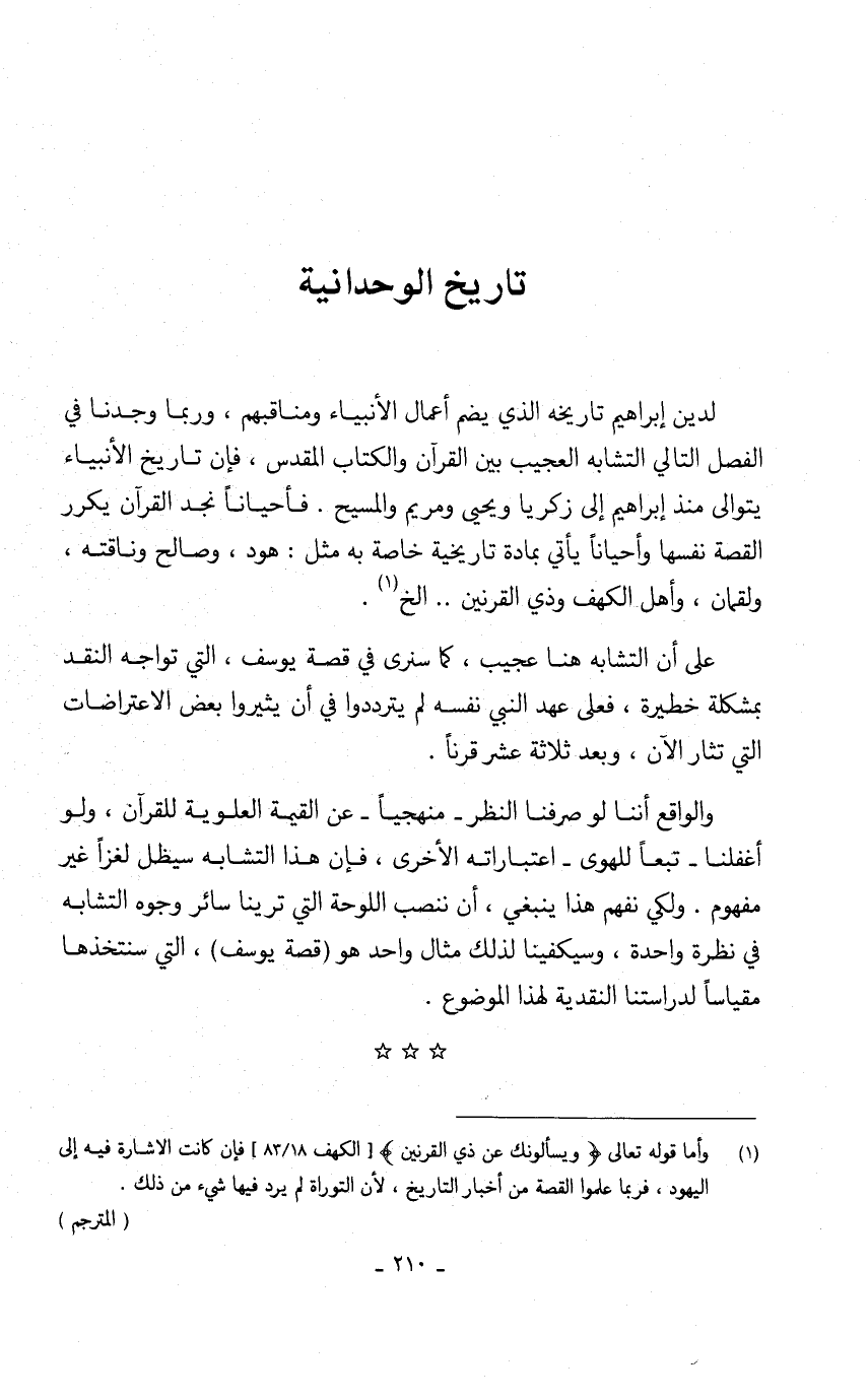 لدين إبراهيم تاريخه الذي يضم أعمال الأنبياء ومناقبهم، وربما وجدنا في الفصل التالي التشابه العجيب بين القرآن والكتاب المقدس، فإن تاريخ الأنبياء يتوالى منذ إبراهيم إلى زكريا ويحيى ومريم والمسيح. فأحياناً نجد القرآن يكرر القصة نفسها وأحياناً يأتي بمادة تاريخية خاصة به مثل: هود، وصالح وناقته، ولقمان، وأهل الكهف وذي القرنين .. الخ (1).