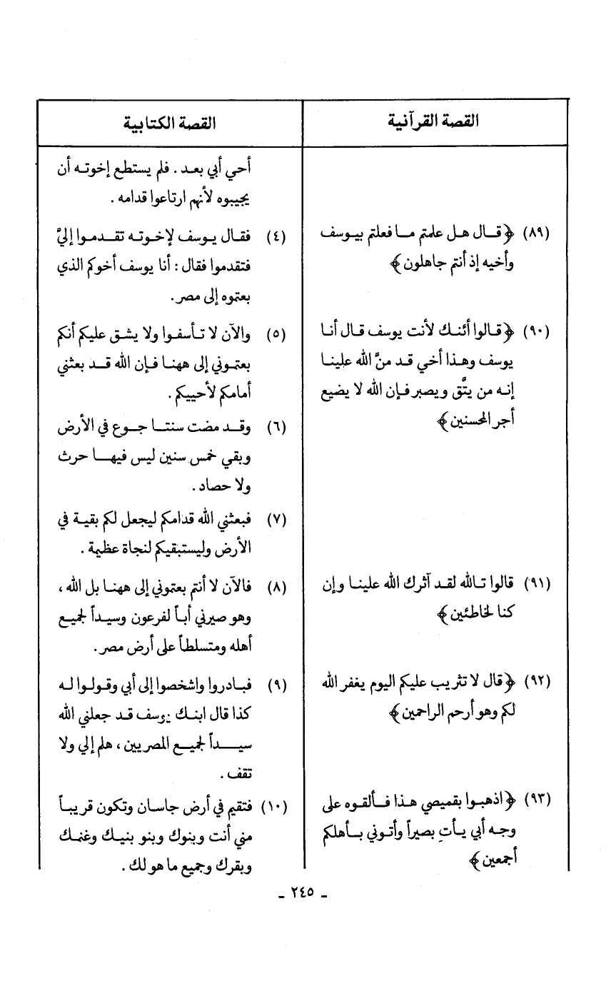 (90) {قَالُوا أَإِنَّكَ لَأَنْتَ يُوسُفُ قَالَ أَنَا يُوسُفُ وَهَذَا أَخِي قَدْ مَنَّ اللَّهُ عَلَيْنَا إِنَّهُ مَنْ يَتَّقِ وَيَصْبِرْ فَإِنَّ اللَّهَ لَا يُضِيعُ أَجْرَ الْمُحْسِنِينَ} ........ (5) والآن لا تأسفوا ولا يشق عليكم أنكم بعتموني إلى ههنا فإن الله قد بعثني أمامكم لأحييكم.