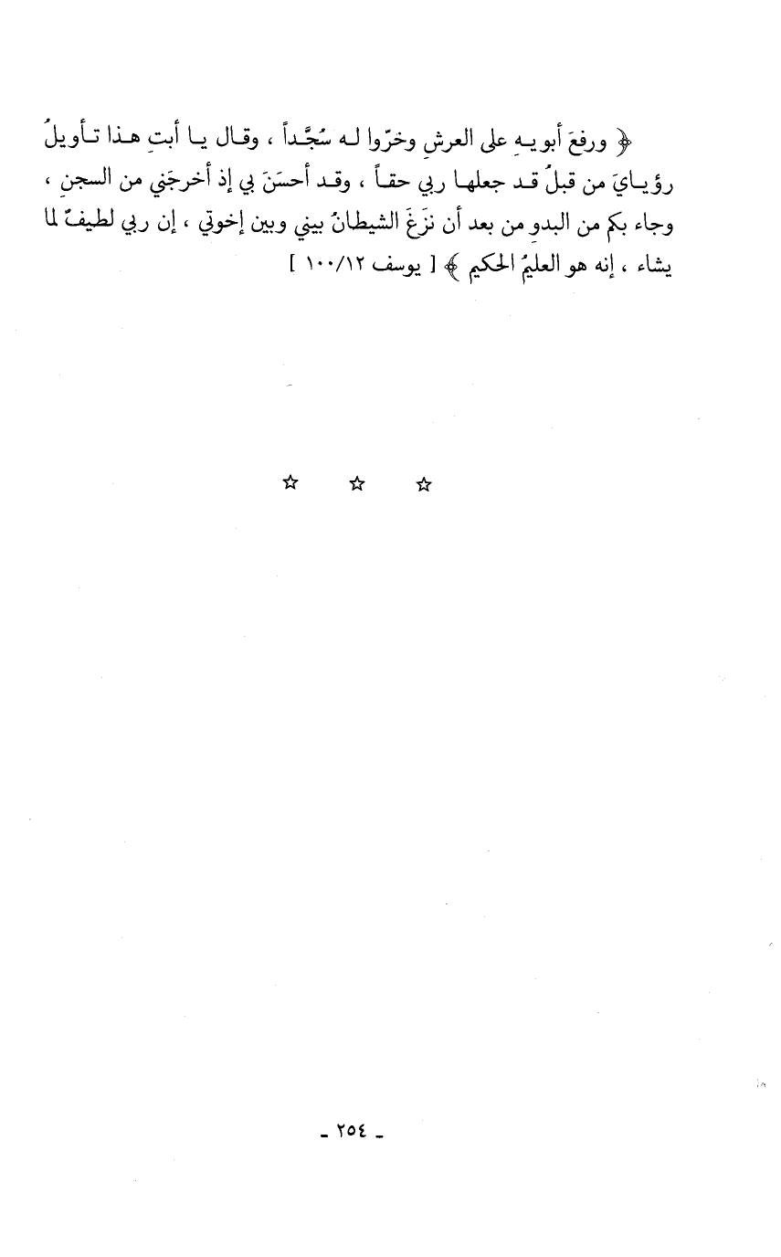 {وَرَفَعَ أَبَوَيْهِ عَلَى الْعَرْشِ وَخَرُّوا لَهُ سُجَّدًا وَقَالَ يَا أَبَتِ هَذَا تَأْوِيلُ رُؤْيَايَ مِنْ قَبْلُ قَدْ جَعَلَهَا رَبِّي حَقًّا وَقَدْ أَحْسَنَ بِي إِذْ أَخْرَجَنِي مِنَ السِّجْنِ وَجَاءَ بِكُمْ مِنَ الْبَدْوِ مِنْ بَعْدِ أَنْ نَزَغَ الشَّيْطَانُ بَيْنِي وَبَيْنَ إِخْوَتِي إِنَّ رَبِّي لَطِيفٌ لِمَا يَشَاءُ إِنَّهُ هُوَ الْعَلِيمُ الْحَكِيمُ} [يوسف 100/ 12]