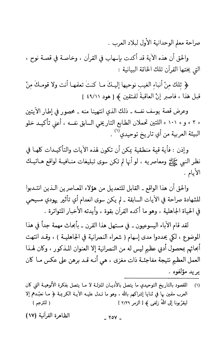 (1) المقصود بالتاريخ التوحيدي ما يتصل بالأديان المنزلة لا ما يتصل بفكرة الألوهية التي كان العرب ملمين بها في ثنايا إشراكهم بالله، وهو ما تدل عليه الآية الكريمة {مَا نَعْبُدُهُمْ إِلَّا لِيُقَرِّبُونَا إِلَى اللَّهِ زُلْفَى} [الزمر 3/ 39] (المترجم)