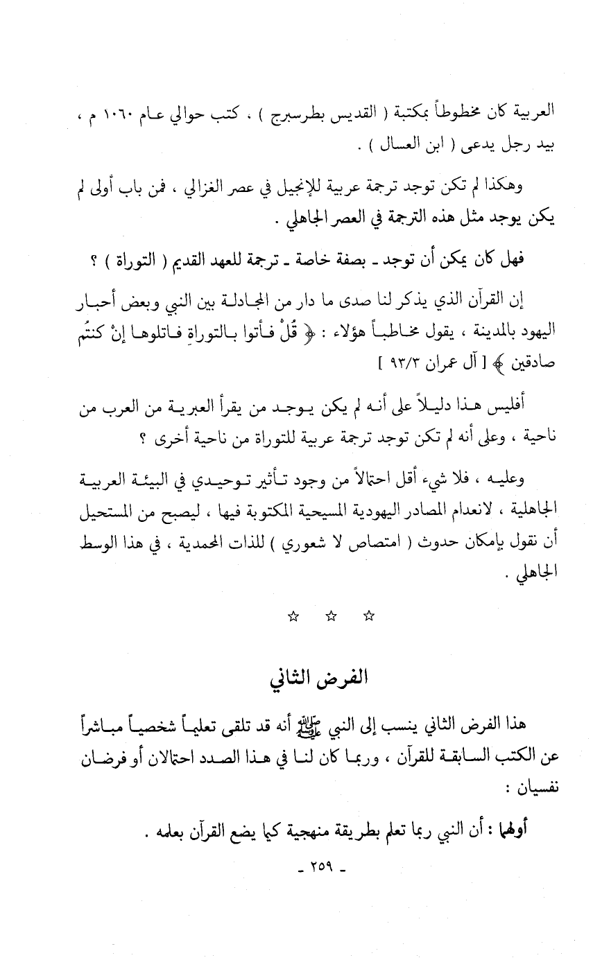 وهكذا لم تكن توجد ترجمة عربية للإنجيل في عصر الغزالي، فمن باب أولى لم يكن يوجد مثل هذه الترجمة في العصر الجاهلي.