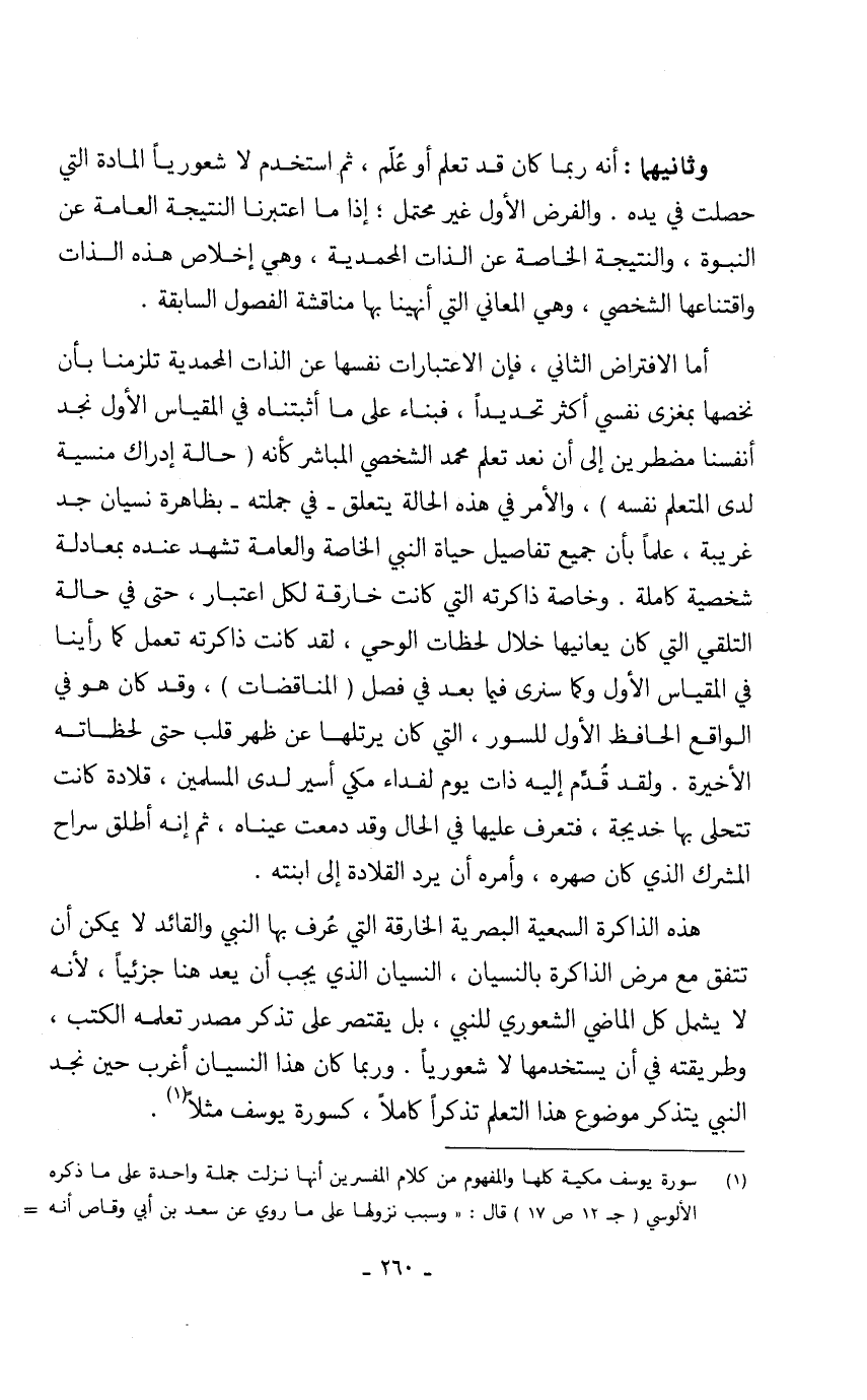 وثانيهما: أنه ربما كان قد تعلم أو عُلِّم، ثم استخدم لا شعورياً المادة التي حصلت في يده. والفرض الأول غير محتمل؛ إذا ما اعتبرنا النتيجة العامة عن النبوة، والنتيجة الخاصة عن الذات المحمدية، وهي إخلاص هذه الذات واقتناعها الشخصي، وهي المعاني التي أنهينا بها مناقشة الفصول السابقة.