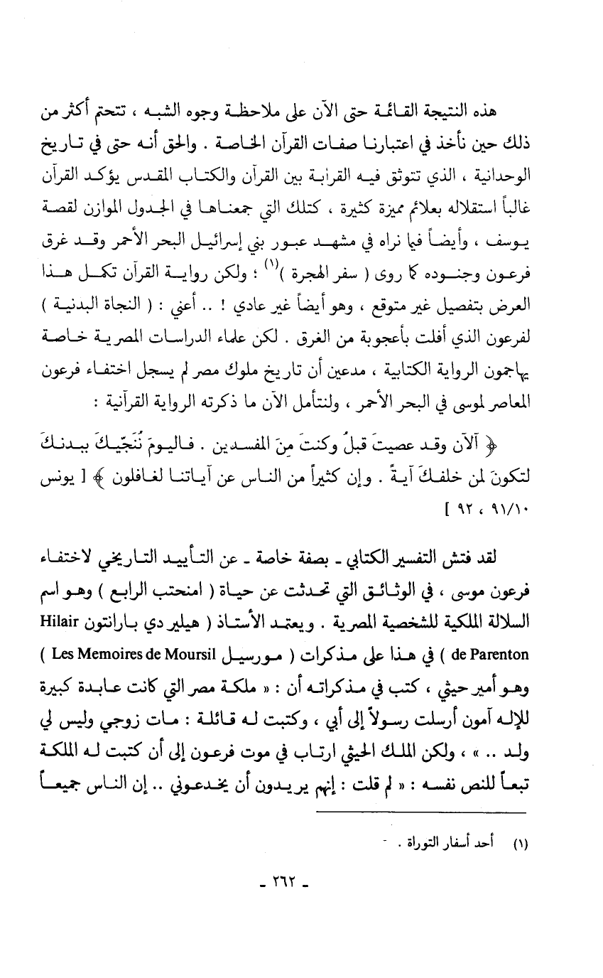 هذه النتيجة القائمة حتى الآن على ملاحظة وجوه الشبه، تتحتم أكثر من ذلك حين نأخذ في اعتبارنا صفات القرآن الخاصة. والحق أنه حتى في تاريخ الوحدانية، الذي تتوثق فيه القرابة بين القرآن والكتاب المقدس يؤكد القرآن غالباً استقلاله بعلائم مميزة كثيرة، كتلك التي جمعناها في الجدول الموازن لقصة يوسف، وأيضاً فيما نراه في مشهد عبور بني إسرائيل البحر الأحمر وقد غرق فرعون وجنوده كما روى (سفر الهجرة) (1) ة ولكن رواية القرآن تكمل هذا العرض بتفصيل غير متوقع، وهو أيضاً غير عادي! .. أعني: (النجاة البدنية) لفرعون الذي أفلت بأعجوبة من الغرق. لكن علماء الدراسات المصرية خاصة يهاجمون الرواية الكتابية، مدعين أن تاريخ ملوك مصر لم يسجل اختفاء فرعون المعاصر لموسى في البحر الأحمر، ولنتأمل الآن ما ذكرته الرواية القرآنية: