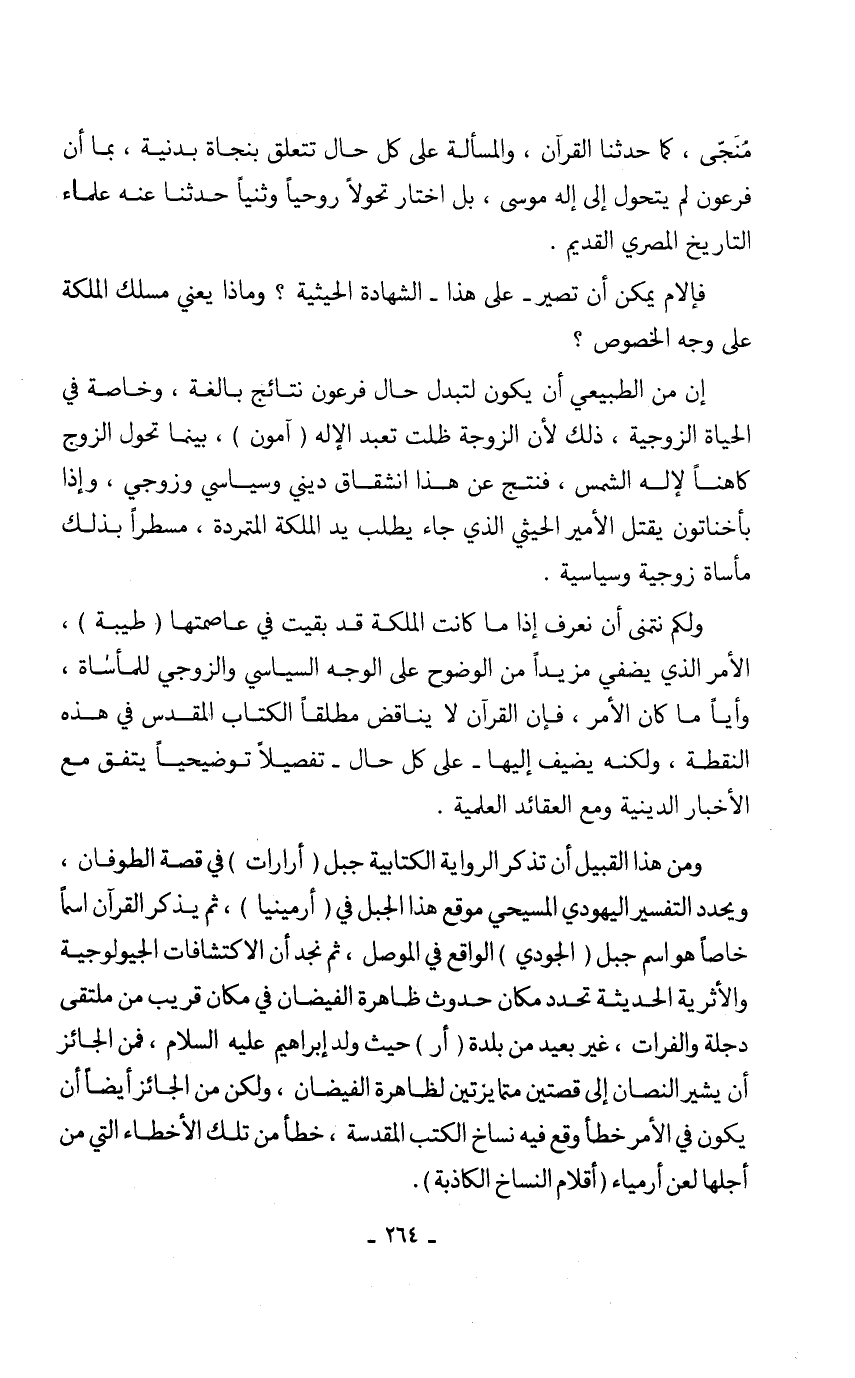 ومن هذا القبيل أن تذكر الرواية الكتابية جبل (أرارات) في قصة الطوفان، ويحدد التفسير اليهودي المسيحي موقع هذا الجبل في (أرمينيا)، ثم يذكر القرآن اسماً خاصاً هو اسم جبل (الجودي) الواقع في الموصل، ثم نجد أن الاكتشافات الجيولوجية والأثرية الحديثة تحدد مكان حدوث ظاهرة الفيضان في مكان قريب من ملتقى دجلة والفرات، غير بعيد من بلدة (أر) حيث ولد إبراهيم عليه السلام، فمن الجائز أن يشير النصان إلى قصتين متمايزتين لظاهرة الفيضان، ولكن من الجائز أيضا أن يكون في الأمر خطأ وقع فيه نساخ الكتب المقدسة، خطأ من تلك الأخطاء التي من أجلها لعن أرمياء (أقلام النساخ الكاذبة).
