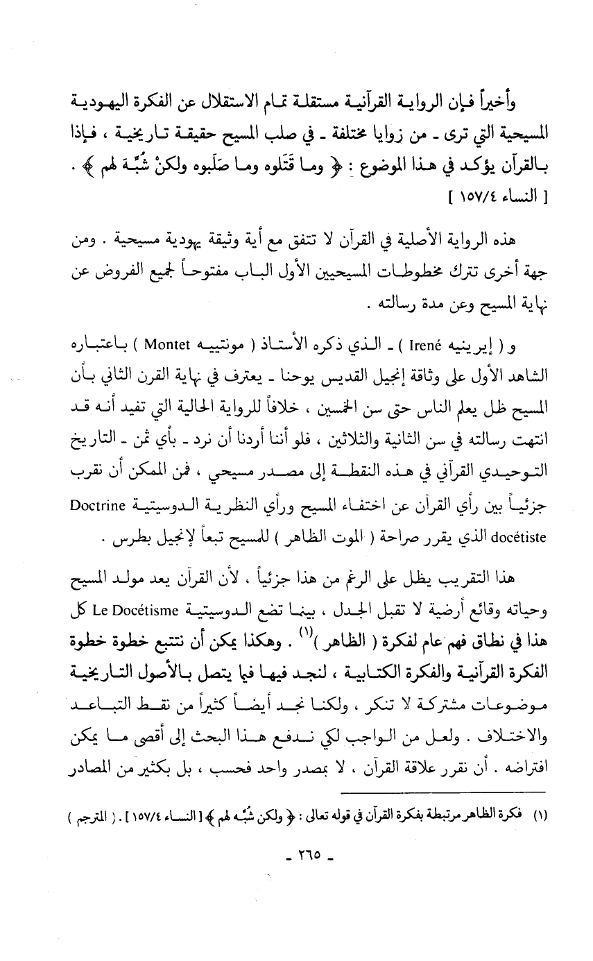 و (إيرينيه Irené) - الذي ذكره الأستاذ (مونتييه Montet) باعتباره الشاهد الأول على وثاقة إنجيل القديس يوحنا- يعترف في نهاية القرن الثاني بأن المسيح ظل يعلم الناس حتى سن الخمسين، خلافاً للرواية الحالية التي تفيد أنه قد انتهت رسالته في سن الثانية والثلاثين، فلو أننا أردنا أن نرد- بأي ثمن- التاريخ التوحيدي القرآني في هذه النقطة إلى مصدر مسيحي، فمن الممكن أن نقرب جزئياً بين رأي القرآن عن اختفاء المسيح ورأي النظرية الدوسيتية Doctrine docétiste) الذي يقرر صراحة (الموت الظاهر) للمسيح تبعاً لإنجيل بطرس.