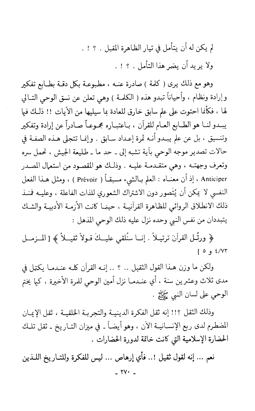 وهو مع ذلك يرى (كلمة) صادرة عنه، مطبوعة بكل دقة بطابع تفكير وإرادة ونظام، وأحياناً تبدو هذه (الكلمة) وهي تعلن عن نسق الوحي التالي لها، فكأنما احتوت على علم سابق خارق للعادة بما سيليها من الآيات!! ذلك فيما يبدو لنا هو الطابع العام للقرآن، باعتباره مجموعاً صادراً عن إرادة وتفكير وتنسيق، بل عن علم يبدو أنه ثمرة إعداد سابق. وإنما تتجلى هذه الصفة في حالات تصدير موجه الوحي بآية تشبه إلى- حد ما- طليعة الجيش، تحمل سره وتعرف وجهته، وهي متقدمة عليه. وذلك هو المقصود من استعمال المصدر Anticiper، إذ أن معناه: العلم بالشيء مسبقاً ( Prévoir) ، ومثل هذا الفعل النفسي لا يمكن أن يُتَصور دون الاشتراك الشعوري للذات الفاعلة، وعليه فمنذ ذلك الانطلاق الروائي للظاهرة القرآنية، حينما كانت الأزمة الأدبية والشك يتبددان من نفس النبي وحده نزل عليه ذلك الوحي المذهل: