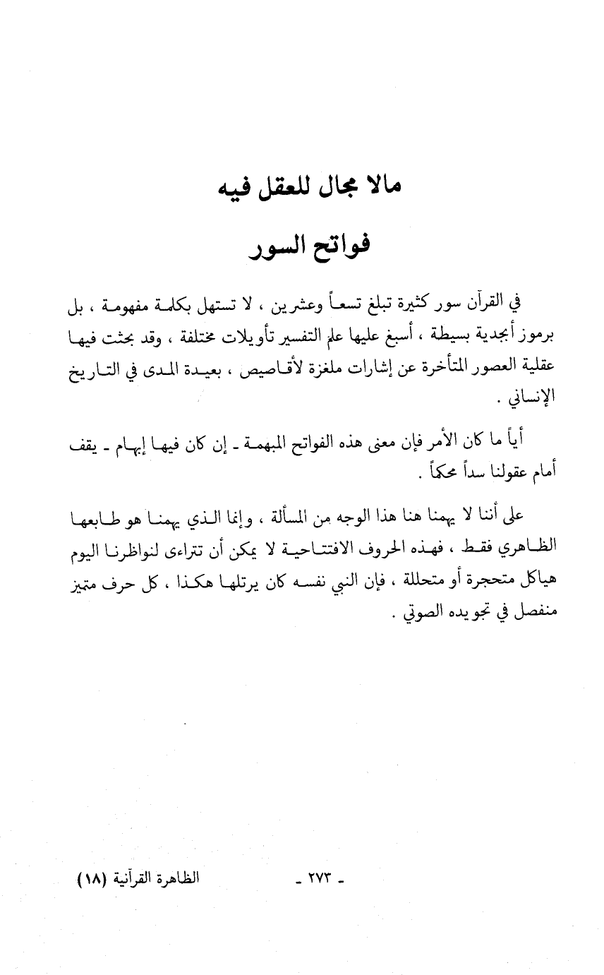 على أننا لا يهمنا هنا هذا الوجه من المسألة، وإنما الذي يهمنا هو طابعها الظاهري فقط، فهذه الحروف الافتتاحية لا يمكن أن تتراءى لنواظرنا اليوم هياكل متحجرة أو متحللة، فإن النبي نفسه كان يرتلها هكذا، كل حرف متميز منفصل في تجويده الصوتي.