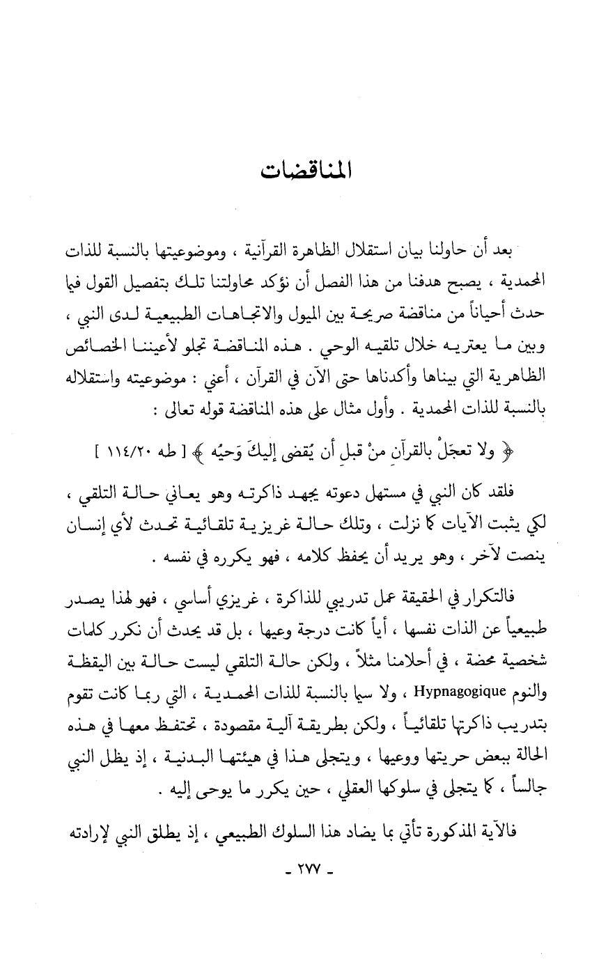 بعد أن حاولنا بيان استقلال الظاهرة القرآنية، وموضوعيتها بالنسبة للذات المحمدية، يصبح هدفنا من هذا الفصل أن نؤكد محاولتنا تلك بتفصيل القول فيما حدث أحياناً من مناقضة صريحة بين الميول والاتجاهات الطبيعية لدى النبي، وبين ما يعتريه خلال تلقيه الوحي. هذه المناقضة تجلو لأعيننا الخصائص الظاهرية التي بيناها وأكدناها حتى الآن في القرآن، أعني: موضوعيته واستقلاله بالنسبة للذات المحمدية. وأول مثال على هذه المناقضة قوله تعالى: