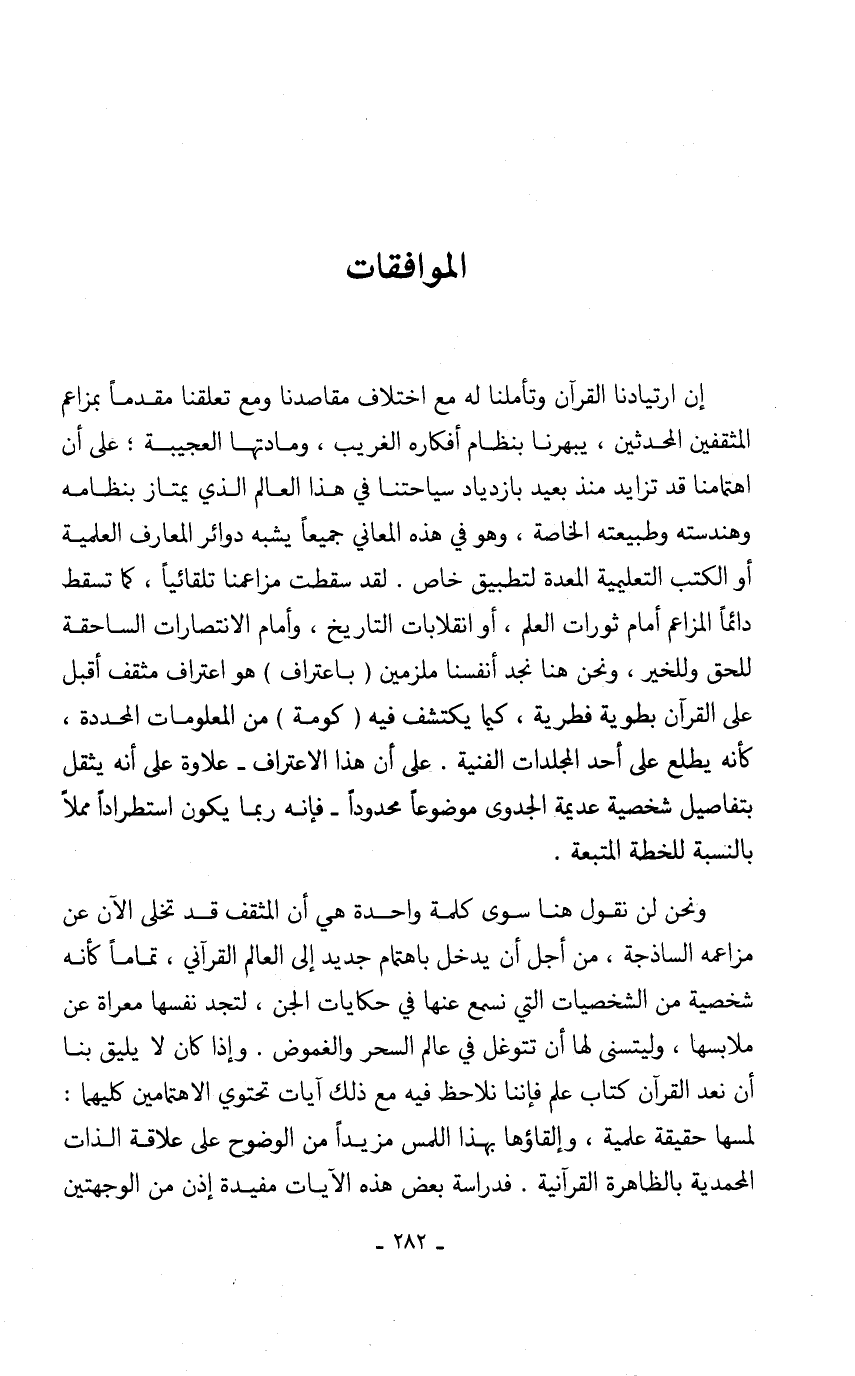 إن ارتيادنا القرآن وتأملنا له مع اختلاف مقاصدنا ومع تعلقنا مقدماً بمزاعم المثقفين المحدثين، يبهرنا بنظام أفكاره الغريب، ومادتها العجيبة؛ على أن اهتمامنا قد تزايد منذ بعيد بازدياد سياحتنا في هذا العالم الذي يمتاز بنظامه وهندسته وطبيعته الخاصة، وهو في هذه المعاني جميعاً يشبه دوائر المعارف العلمية أو الكتب التعليمية المعدة لتطبيق خاص. لقد سقطت مزاعمنا تلقائياً، كما تسقط دائماً المزاعم أمام ثورات العلم، أو انقلابات التاريخ، وأمام الانتصارات الساحقة للحق وللخير، ونحن هنا نجد أنفسنا ملزمين (باعتراف) هو اعتراف مثقف أقبل على القرآن بطوية فطرية، كيما يكتشف فيه (كومة) من المعلومات المحددة، كأنه يطلع على أحد المجلدات الفنية. على أن هذا الاعتراف- علاوة على أنه يثقل بتفاصيل شخصية عديمة الجدوى موضوعاً محدوداً- فإنه ربما يكون استطراداً مملاً بالنسبة للخطة المتبعة.
