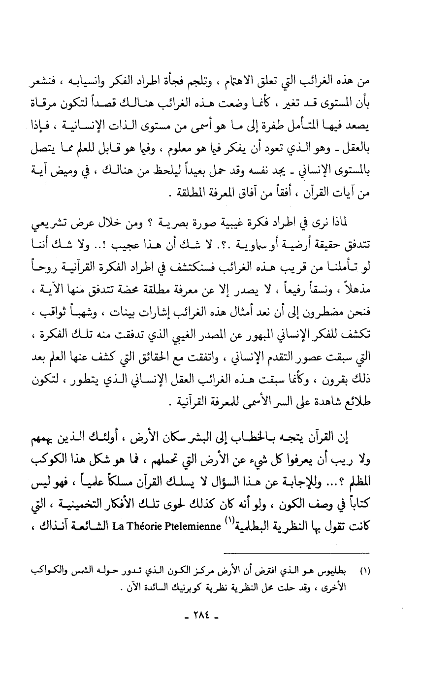 إن القرآن يتجه بالخطاب إلى البشر سكان الأرض، أولئك الذين يهمهم ولا ريب أن يعرفوا كل شيء عن الأرض التي تحملهم، فما هو شكل هذا الكوكب المظلم؟ ... وللإجابة عن هذا السؤال لا يسلك القرآن مسلكاً علمياً، فهو ليس كتاباً في وصف الكون، ولو أنه كان كذلك لحوى تلك الأفكار التخمينية، التي كانت تقول بها النظرية البطلمية (1) La Théorie Ptelemienne الشائعة آنذاك،