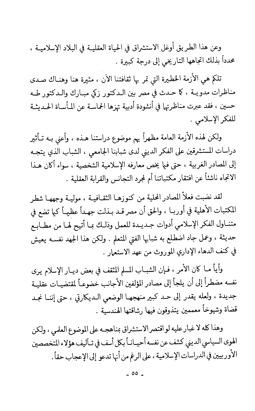 ولكن لهذه الأزمة العامة مظهراً يهم موضوع دراستنا هذه، وأعني به تأثير دراسات المستشرقين على الفكر الديني لدى شبابنا الجامعي، الشباب الذي يتجه إلى المصادر الغربية، حتى فيما يخص معارفه الإسلامية الشخصية، سواء أكان هذا الاتجاه ناشئاً عن افتقار مكتباتنا أم لمجرد التجانس والقرابة العقلية.
