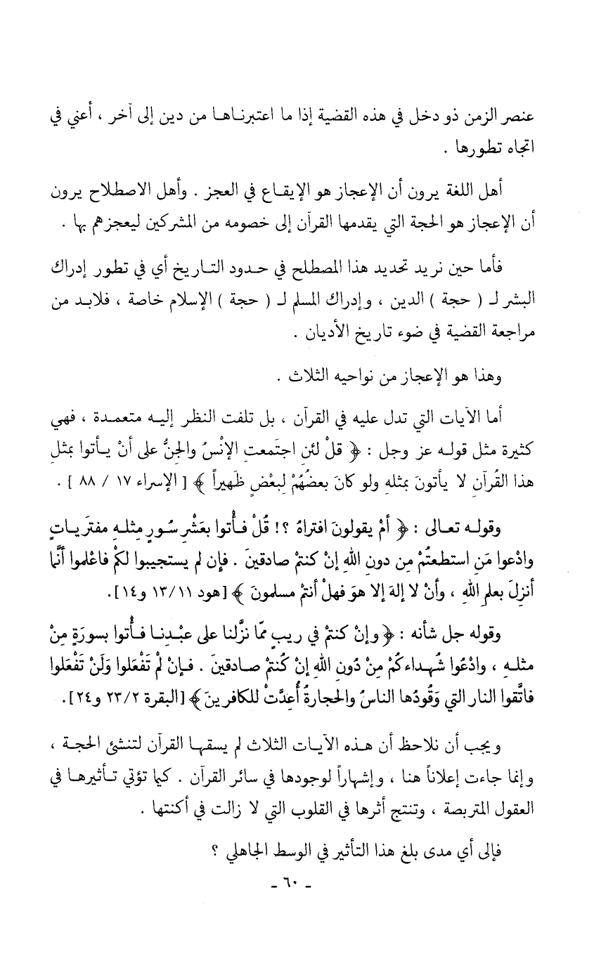 أهل اللغة يرون أن الإعجاز هو الإيقاع في العجز. وأهل الاصطلاح يرون أن الإعجاز هو الحجة التي يقدمها القرآن إلى خصومه من المشركين ليعجزهم بها. فأما حين نريد تحديد هذا المصطلح في حدود التاريخ أي في تطور إدراك البشر لـ (حجة) الدين، وإدراك المسلم لـ (حجة) الإسلام خاصة، فلابد من مراجعة القضية في ضوء تاريخ الأديان.