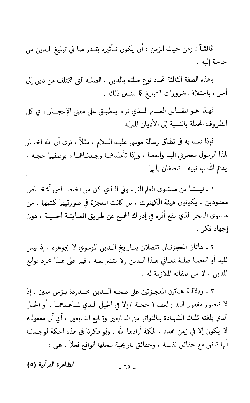 3 - ودلالة هاتين المعجزتين على صحة الدين محدودة بزمن معين، إذ لا نتصور مفعول اليد والعصا (حجة) إلا في الجيل الذي شاهدهما، أو الجيل الذي بلغته تلك الشهادة بالتواتر من التابعين وتابع التابعين، أي أن مفعوله لا يكون إلا في زمن محدد، لحكمة أرادها الله. ولو فكرنا في هذه الحكمة لوجدنا أنها تتفق مع حقائق نفسية، وحقائق تاريخية سجلها الواقع فعلاً، هي: