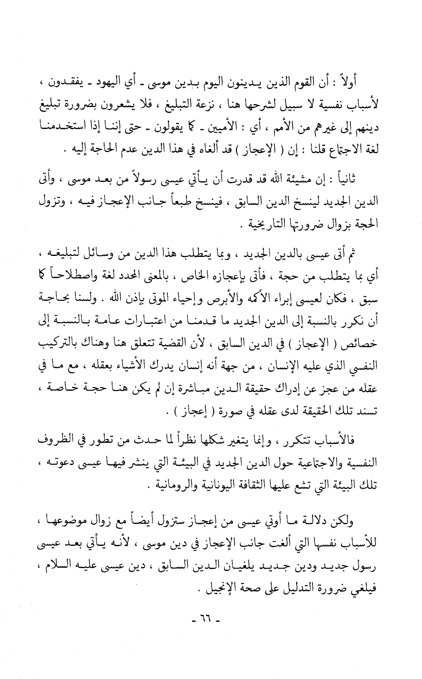 أولاً: أن القوم الذين يدينون اليوم بدين موسى- أي اليهود- يفقدون، لأسباب نفسية لا سبيل لشرحها هنا، نزعة التبليغ، فلا يشعرون بضرورة تبليغ دينهم إلى غيرهم من الأمم، أي: الأميين- كما يقولون- حتى إننا إذا استخدمنا لغة الاجتماع قلنا: إن (الإعجاز) قد ألغاه في هذا الدين عدم الحاجة إليه.