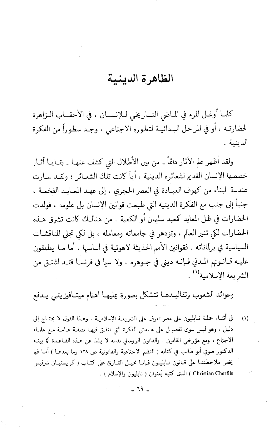 (1) في أثناء حملة نابليون على مصر تعرف على الشريعة الإسلامية، وهذا القول لا يحتاج إلى دليل، وهو ليس سوى تفصيل على هامش الفكرة التي نتفق فيها بصفة عامة مع علماء الاجتماع، ومع مؤرخي القانون. والقانون الروماني نفسه لا يشذ عن هذه القاعدة كما بينه الدكتور صوفي أبو طالب في كتابه (النظم الاجتماعية والقانونية [ص:128] وما بعدها) أما فيما يخص ملاحظتنا على قانون نابليون فإنا نحيل القارئ على كتاب (كريستيان شرفيس Christian Cherfils) الذي كتبه بعنوان (نابليون والإسلام).