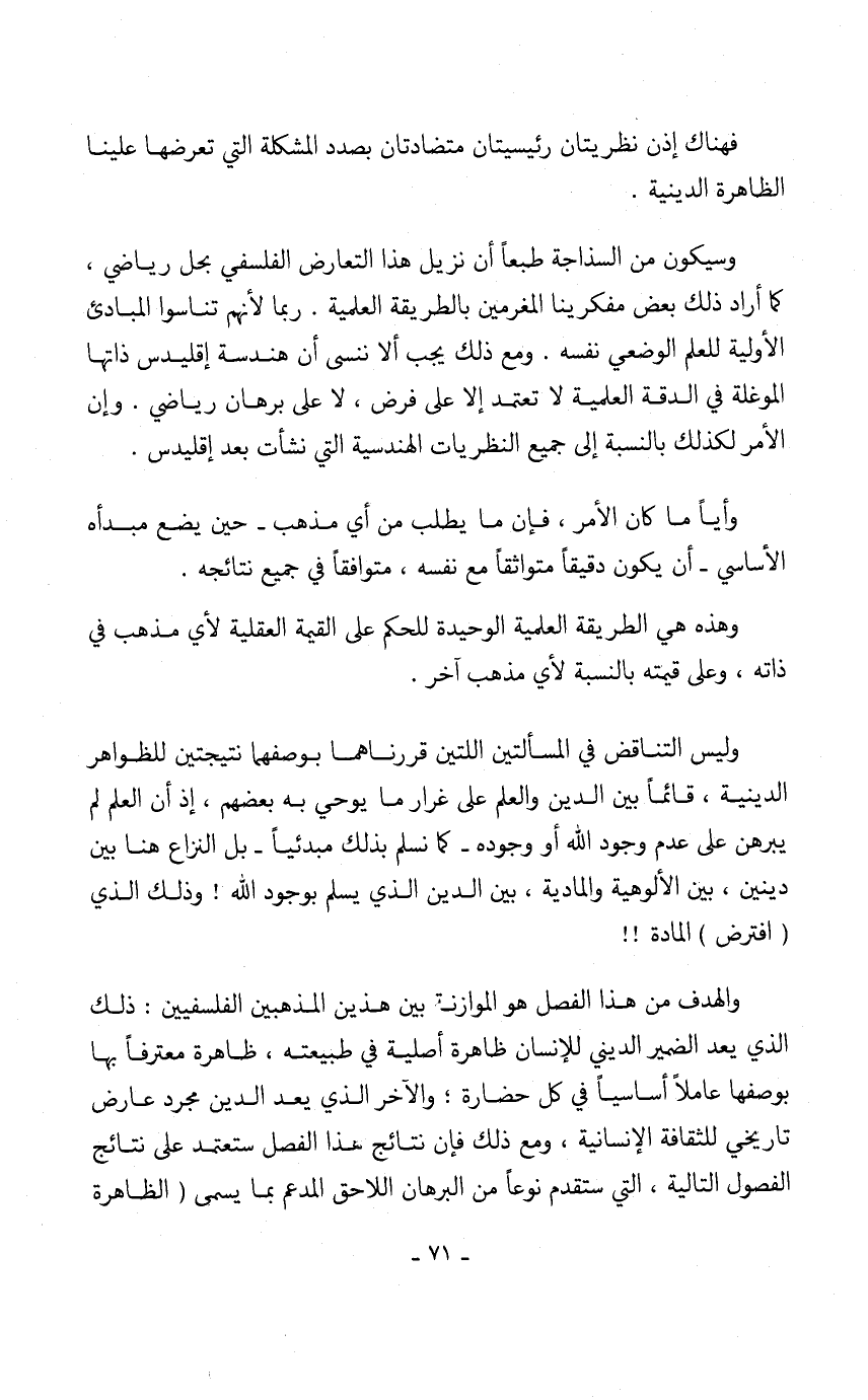 وليس التناقض في المسألتين اللتين قررناهما بوصفهما نتيجتين للظواهر الدينية، قائماً بين الدين والعلم على غرار ما يوحي به بعضهم، إذ أن العلم لم يبرهن على عدم وجود الله أو وجوده- كما نسلم بذلك مبدئياً- بل النزاع هنا بين دينين، بين الألوهية والمادية، بين الدين الذي يسلم بوجود الله! وذلك الذي (افترض) المادة!!