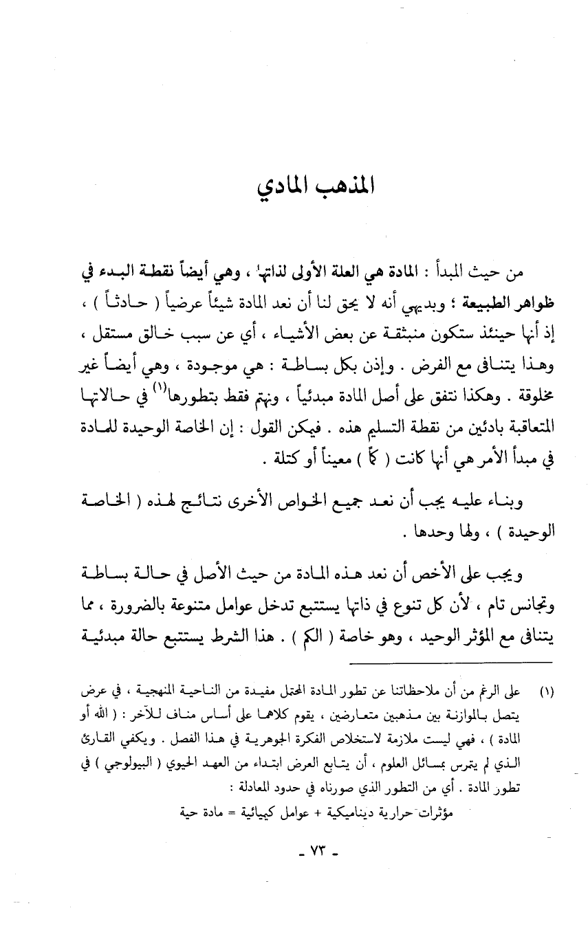 (1) على الرغم من أن ملاحظاتنا عن تطور المادة المحتمل مفيدة من الناحية المنهجية، في عرض يتصل بالموازنة بين مذهبين متعارضين، يقوم كلاهما على أساس مناف للآخر: (الله أو المادة)، فهي ليست ملازمة لاستخلاص الفكرة الجوهرية في هذا الفصل. ويكفي القارئ الذي لم يتمرس بمسائل العلوم، أن يتابغ العرض ابتداء من العهد الحيوي (البيولوجي) في تطور المادة. أي من التطور الذي صورناه في حدود المعادلة: