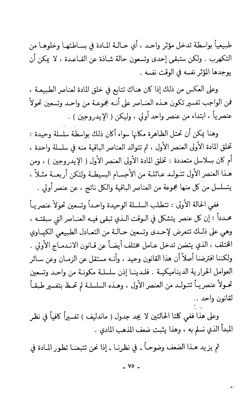 وعلى هذا ففي كلتا الحالتين لا يجد جدول (ماندليف) تفسيراً كافياً في نظر المبدأ الذي نسلم به، وهذا يثبت ضعف المذهب المادي.