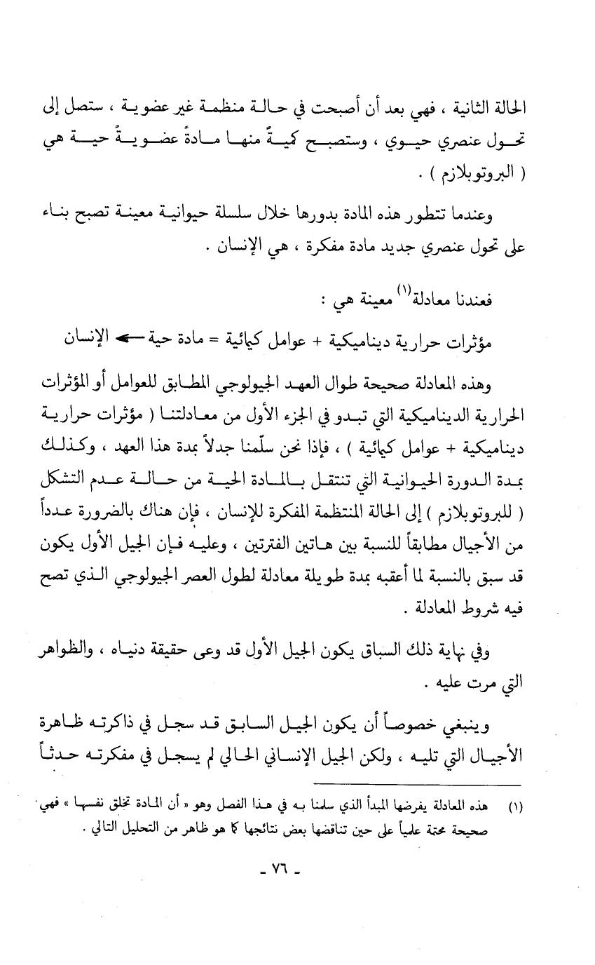 وهذه المعادلة صحيحة طوال العهد الجيولوجي المطابق للعوامل أو المؤثرات الحرارية الديناميكية التي تبدو في الجزء الأول من معادلتنا (مؤثرات حرارية ديناميكية + عوامل كيمائية)، فإذا نحن سلّمنا جدلاً بمدة هذا العهد، وكذلك بمدة الدورة الحيوانية التي تنتقل بالمادة الحية من حالة عدم التشكل (للبروتوبلازم) إلى الحالة المنتظمة الفكرة للإنسان، فإن هناك بالضرورة عدداً من الأجيال مطابقاً للنسبة بين هاتين الفترتين، وعليه فإن الجيل الأول يكون قد سبق بالنسبة لما أعقبه بمدة طويلة معادلة لطول العصر الجيولوجي الذي تصح فيه شروط المعادلة.