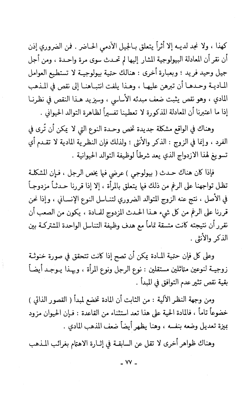 فإذا كان هناك حدث (بيولوجي) عرضي فيما يخص الرجل، فإن المشكلة تظل تواجهنا على الرغم من ذلك فيما يتعلق بالمرأة، إلا إذا قررنا حدثا مزدوجاً في الأصل، نتج عنه الزوج المتوالد الضروري لتناسل النوع الإنساني، وإذا نحن قررنا على الرغم من كل شيء هذا الحدث المزدوج للمادة، يكون من الصعب أن نقرر أن نتيجته كانت متسقة تماماً مع هدف وظيفة التناسل الواحدة المشتركة بين الذكر والأنثى.