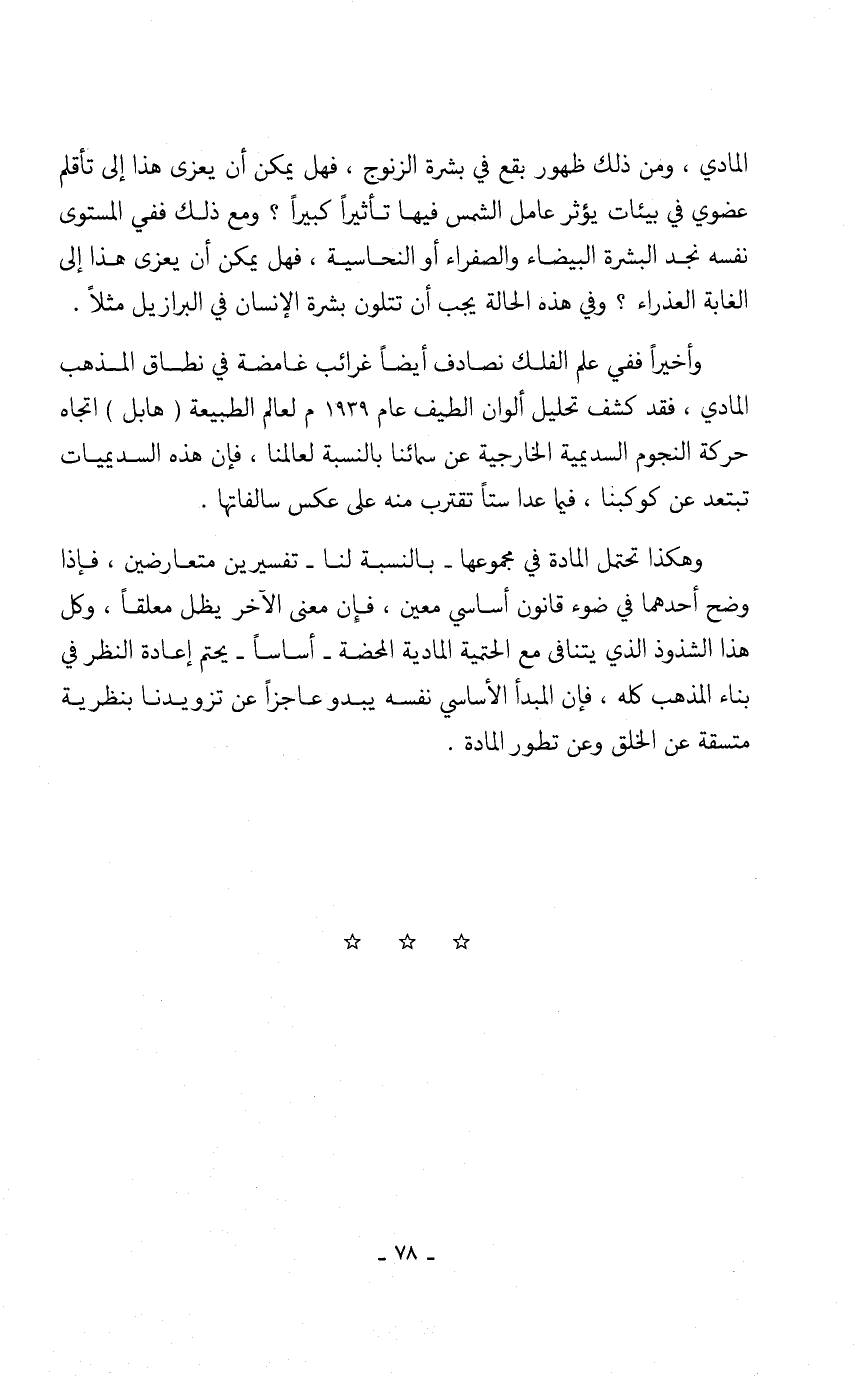 وأخيراً ففي علم الفلك نصادف أيضاً غرائب غامضة في نطاق المذهب المادي، فقد كشف تحليل ألوان الطيف عام 1939م لعالم الطبيعة (هابل) اتجاه حركة النجوم السديمية الخارجية عن سمائنا بالنسبة لعالمنا، فإن هذه السديميات تبتعد عن كوكبنا، فيما عدا ستاً تقترب منه على عكس سالفاتها.