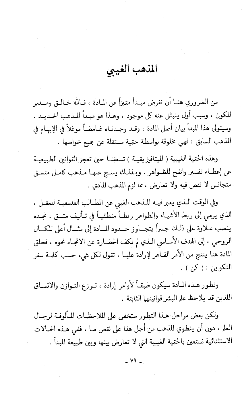 وفي الوقت الذي يعبر فيه المذهب الغيبي عن المطالب الفلسفية للعقل، الذي يرمي إلى ربط الأشياء والظواهر ربطاً منطقياً في تأليف متسق، نجده ينصب علاوة على ذلك جسراً يتجاوز حدود المادة إلى مثال أعلى للكمال الروحي، إلى الهدف الأساسي الذي لم تكف الحضارة عن الاتجاه نحوه، فحلق المادة هنا ينتج من الأمر القاهر لإرادة عليا، تقول لكل شيء حسب كلمة سفر التكوين: (كن).