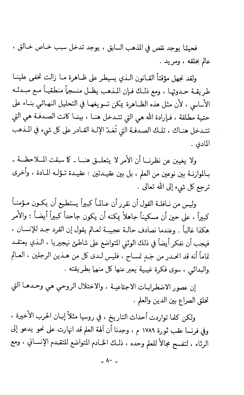 وليس من نافلة القول أن نقرر أن عالماً كبيراً يستطيع أن يكون مؤمناً كبيراً، على حين أن مسكيناً جاهلاً يمكنه أن يكون جاحداً كبيراً أيضاً؛ والأمر هكذا غالباً. وعندما نصادف حالة عجيبة لعالم يقول إن القرد جد للإنسان، فيجب أن نفكر أيضاً في ذلك الوثني المتواضع على شاطئ نيجيريا، الذي يعتقد تماماً أنه قد انحدر من جَدٍ تمساح، فليس لدى كل من هذين الرجلين، العالم والبدائي، سوى فكرة غيبية يعبر عنها كل منهما بطريقته.