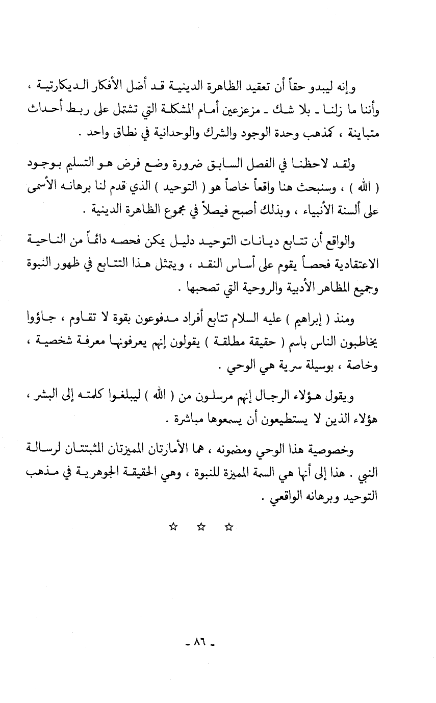 والواقع أن تتابع ديانات التوحيد دليل يمكن فحصه دائماً من الناحية الاعتقادية فحصاً يقوم على أساس النقد، ويتمثل هذا التتابع في ظهور النبوة وجميع المظاهر الأدبية والروحية التي تصحبها.