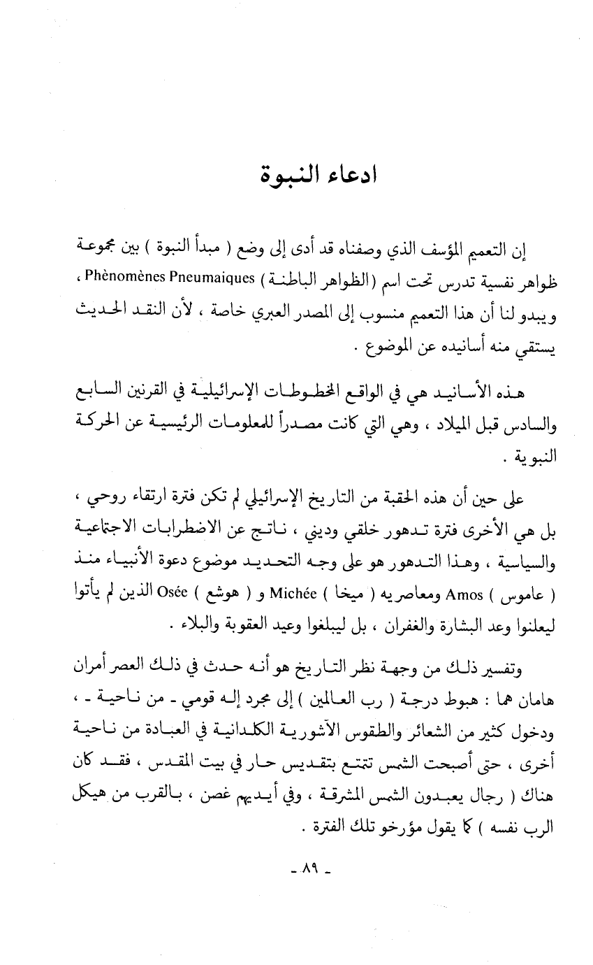 إن التعميم الؤسف الذي وصفناه قد أدى إلى وضع (مبدأ النبوة) بين مجموعة ظواهر نفسية تدرس تحت اسم (الظواهر الباطنة) Phènomènes Pneumaiques، ويبدو لنا أن هذا التعميم منسوب إلى المصدر العبري خاصة، لأن النقد الحديث يستقي منه أسانيده عن الموضوع.
