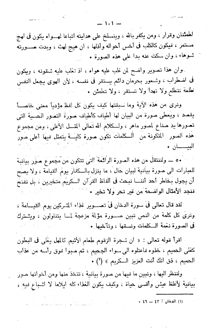 عاقبته أن حُرِ َم مما طغى به، وصار يوم القيامة أمام الجزاء الأليم، بيد أنَّ أولئك أصحاب الجنة وهي الحديقة المثمرة، كانت لديهم فرصة الرجاء بعد الندم، أما هؤلاء فقد فاتت فرصة الرجاء ولات حين مناص، ولنذكر بعد ذلك ما نستطيع الإشارة إليه من النواحي البيانية.
