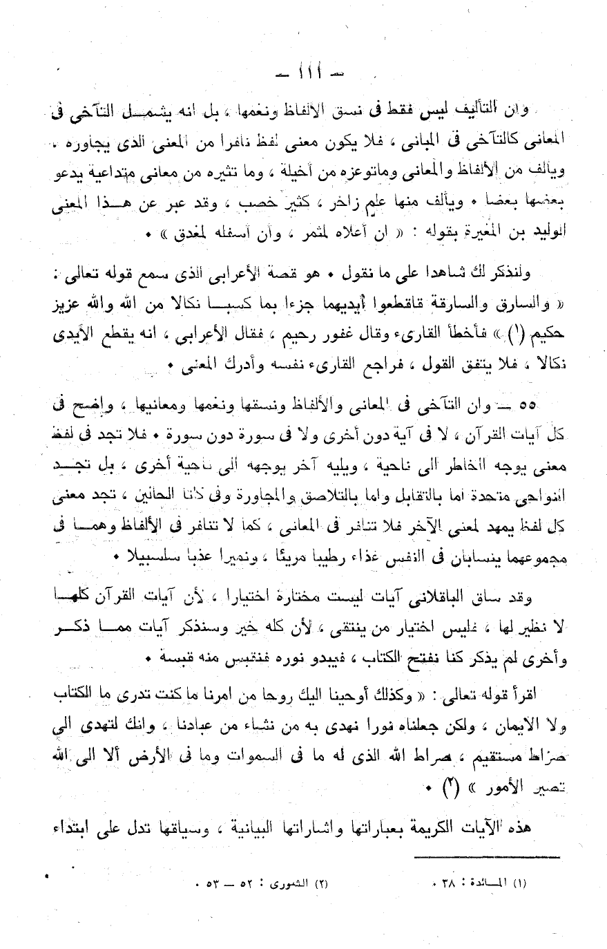 68- وبعد ذلك البيان الذي حاولنا به الوصول إلى بعض أسرار المعاني القرآنية التي تعلو ولا يعلى عليها، واليانعة الثمار الدانية القطوف في أعلاها، والثروة الخصبة المملوءة حياة في أدناها، كما قال البليغ العربي القرشي، نريد أن نشير إشارة إلى ما وصل إليه تفكيرنا في إجمال ما سبق، فنجد: