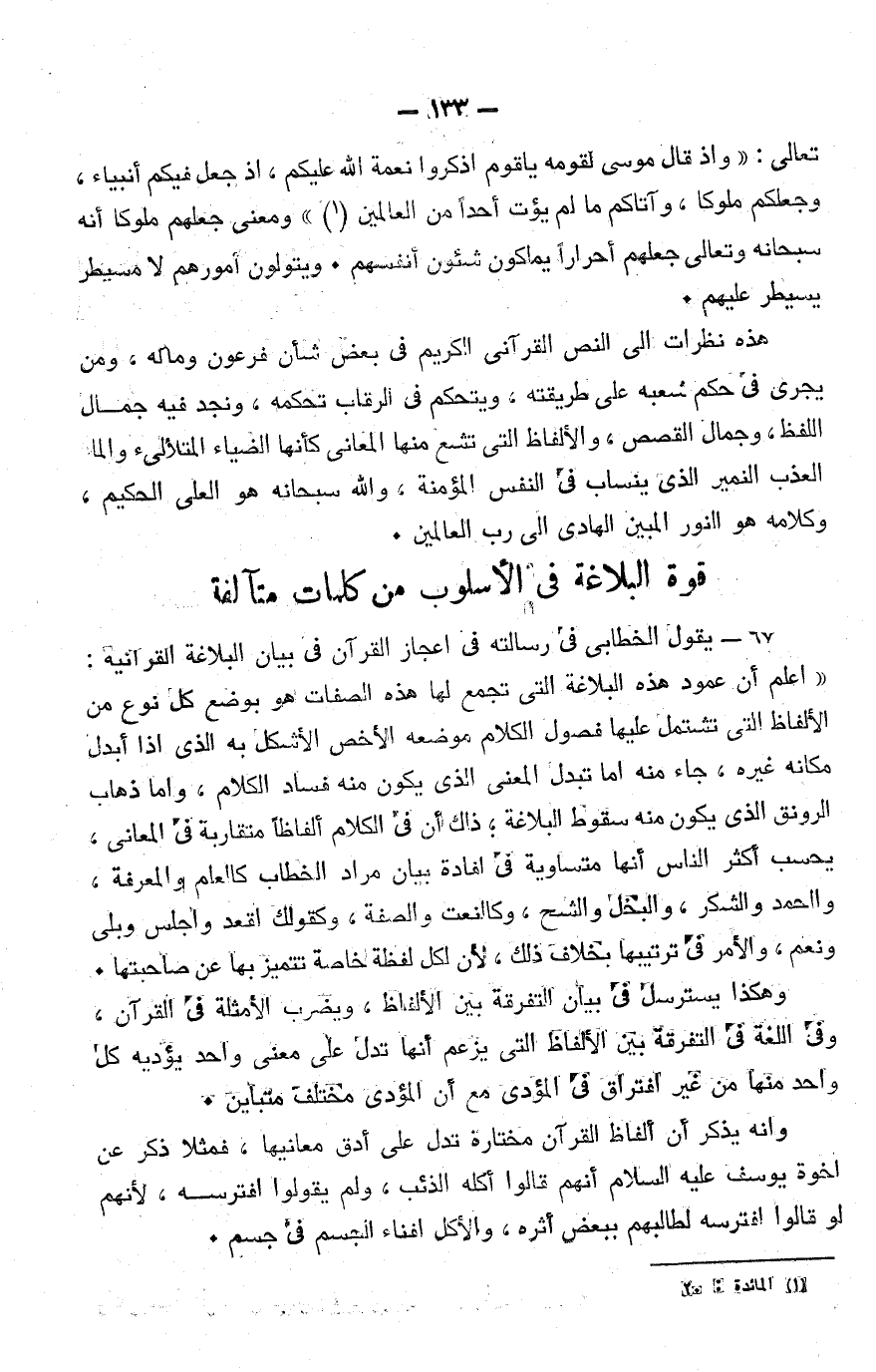 هذه قصة موسى مع فرعون ومع أهل مصر، قد ذكرنا جزءًا منها، وهي في فصول متعددة من أجزاء القرآن الكريم، ونلاحظ مع بلاغة القصص وقوة تأثيره الذي قد نتكلم عليه من بعد، أنَّه لا تكرار في جزء من القصة، فلا يكرر جزء بمعناه في آيات واحدة، بل يذكر أيضًا بمعناه في آيات أخرى، وإنَّ كل جزء من القصة في معناه وجزئياته وغاياته ومراميه إلى مقصد، بل لكل جزء معنى سيق له، لم يسق له غيره، وإذا كانت بعض العبارات أو المعاني تكررت، فإنَّ ذلك لبيان المقصد الأصلي من الجزء، فمثلًا رأينا في لقاء موسى لفرعون أنه ذكرت عبارات النعم وهو رضيع، وكيف سهَّل الله سبيل العيش الرغيد؛ ليبين له سبحانه أنَّه معه في لقاء فرعون، كما كان مع أمه في إلقائه في اليمِّ؛ ليلْقَى فرعون وهو رابط الجأش، وهكذا نجد تكرار بعض المعاني؛ لأنها ذكرت في موضعها الأول مقصودة، وذكرت في موضعها الثاني تمهيدًا لقصده، وتثبيتًا لمغزاه، فالتكرار لم يكن لمجرد التكرار، بل هو تجديد للمعاني، ليس ترديدًا، والفرق بين التجديد ومجرَّد الترديد أنَّ الترديد يكون تكرارًا لا غاية لها، أو يكون لمجرد التوكيد، أما التجديد في تكرار اللفظ فإنه يكون لغاية بعده لا تتمّ إلا به.