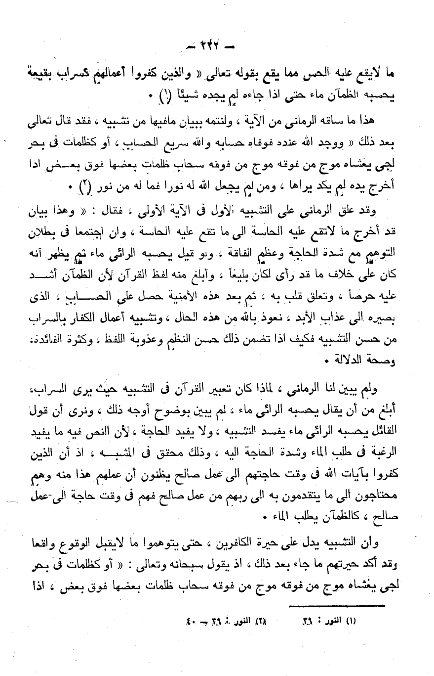 إحداهما: أنَّ موسيقى القرآن الكريم ونغماته هي التي استرعت أسماع العرب، واستهوت نفوسهم، ورأوا لها حلاوة، وعليها طلاوة ليست من الشعر، وإن علت على أعلى ما فيه، وليست من نوع كلامهم البليغ، وإن كانت من جنس كلامهم، وإن ذلك التأليف في النغم والجرس مع علوِّ المغزى والمعنى وإحكام التعبير ودقة الإحكام لا يمكن أن يصل إليه أحد.