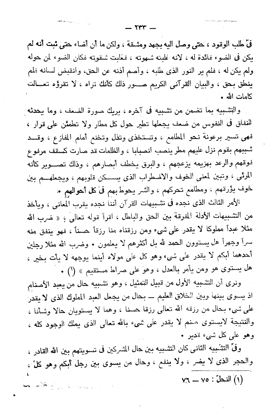 وقوله تعالى: {وَلَا يَحِيقُ الْمَكْرُ السَّيِّئُ إِلَّا بِأَهْلِهِ} [فاطر: 43] ، هي في عمومها وشمولها فيها إيجاز قصر، يمكن أن تكون مثلًا عاليًا يستشهد به في القول، ويصدق على كل خب لئيم، ولكنه قطع الكلام عما قبله وما بعده، فالآية الكريمة بهذا النص السامي {اسْتِكْبَارًا فِي الْأَرْضِ وَمَكْرَ السَّيِّئِ وَلَا يَحِيقُ الْمَكْرُ السَّيِّئُ إِلَّا بِأَهْلِهِ فَهَلْ يَنْظُرُونَ إِلَّا سُنَّةَ الْأَوَّلِينَ فَلَنْ تَجِدَ لِسُنَّةِ اللَّهِ تَبْدِيلًا وَلَنْ تَجِدَ لِسُنَّةِ اللَّهِ تَحْوِيلًا} ، وكنا نود أن يأتي بالمثل الطيب في بيئته من كلمات سابقة له ولاحقة.