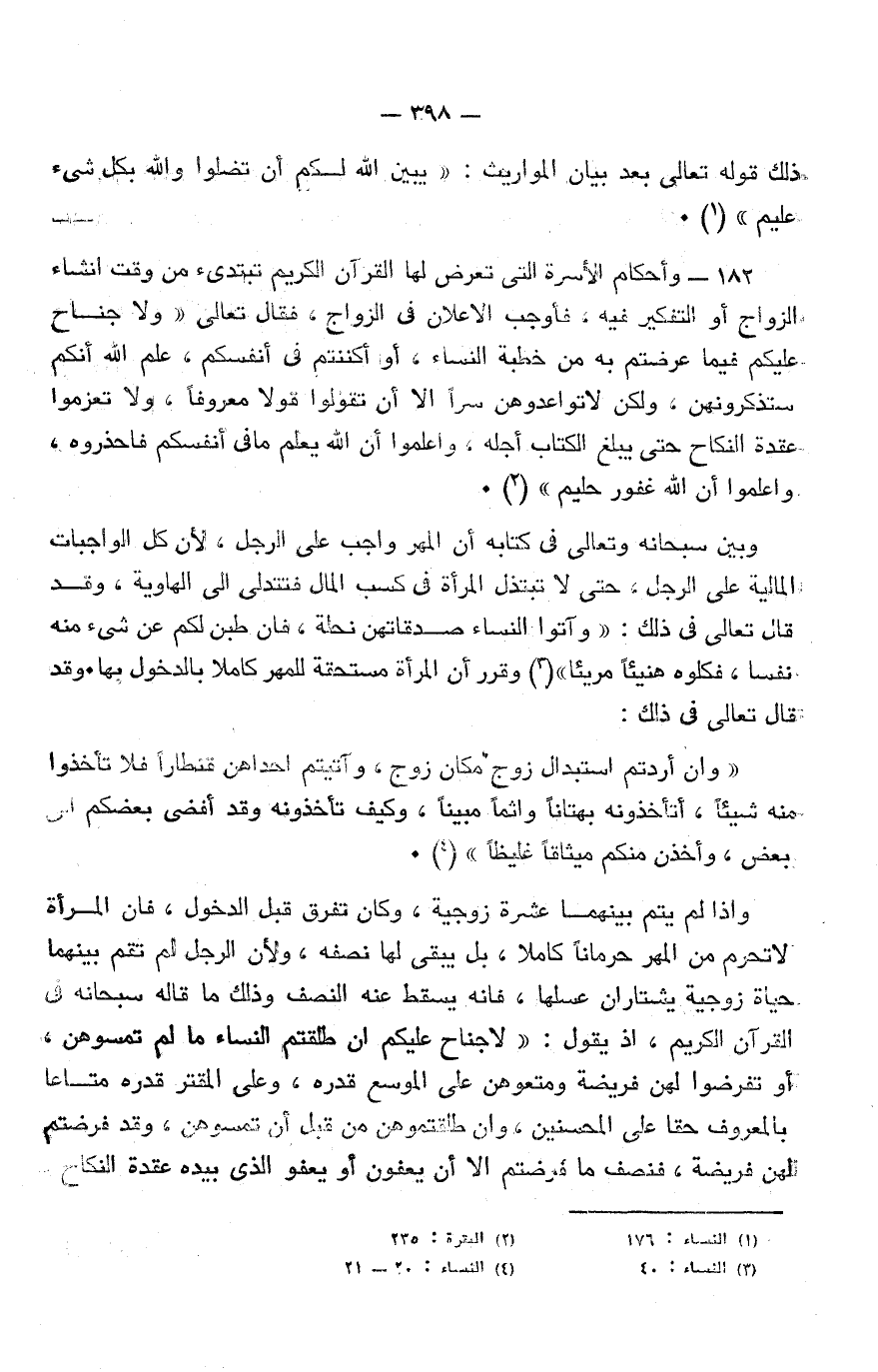 فأولها: وهو أعظمها السنَّة؛ لأنها الشارح الأول للكتاب الكريم، وإنَّ أحكام الحلال والحرام لا تفصيل لها إلَّا في السنة، وهي المصدر الوحيد لها، ومن خالف تفسير السنة للحلال والحرام في القرآن فهو من المفترين على القرآن الكريم، ويكون داخلًا في نهي قوله تعالى: {وَلا تَقُولُوا لِمَا تَصِفُ أَلْسِنَتُكُمُ الْكَذِبَ هَذَا حَلالٌ وَهَذَا حَرَامٌ لِتَفْتَرُوا عَلَى اللَّهِ الْكَذِبَ} [النحل: 116] ؛ وذلك لأنَّ هذا القسم من القرآن الكريم تكفَّلت به السنة النبوية؛ لأنَّ هذا من تبليغ الرسالة المحمدية وهو معناها، ومن يعارضها إنما يعارض تبليغ الرسالة النبوية، ويفتري على الله الكذب، فكل ما في القرآن من أحكام فقهية سواء أكانت تتعلق بالعبادات أم كانت تتعلق بتنظيم المجتمع الإنساني الذي يبتدئ بالأسرة، ويتدرج إلى الجماعات ثم الأمة، وعلاقة الحاكم بالمحكوم، وعلاقة المسلمين بغيرهم من الأمم في السلم والحرب، كل هذا بيان النبي -صلى الله تعالى عليه وسلم، وهو حجة علينا يجب اتباعه.