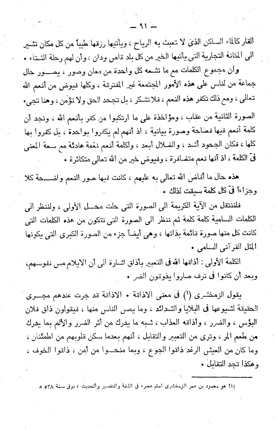 54- قلنا: إن للكلمة إشراقًا خاصًّا، فكل كلمة لها إشعاع فكري، ولكنها لا يبدو منها ذلك الإشعاع والبلاغة البيانية إلا مع أخت لها تناسبها، وتتلاقى فكريًّا معها، فمثلًا كلمة -تنفس- التي ذكرناها في قوله تعالى: {وَالصُّبْحِ إِذَا تَنَفَّس} لا ينبعث منها ذلك الإشعاع الفكري إلّا إذا كانت كلمة الصبح معها، فلا بُدَّ لكي يكون ذلك الإشعاع المعنوي صحيحًا واضحًا مؤديًا إلى غايته من أن يكون مقترنًا بالصبح، ومع أن الإشعاع منها وحدها، إلّا أنه لا يضيء إلا مع كلمة الصبح، وكلمة الصبح تفترق عن كلمة الفجر، إلّا إذا كان يتبعه التنفس والإسفار، فالصبح والتنفس متلازمان، وإن كان كل منهما مؤديًا معنى مستقلًّا، والتلازم كان بألا يتبين ذكل المعنى الاستقلالي إلا بضم الأخرى إلى الأولى.