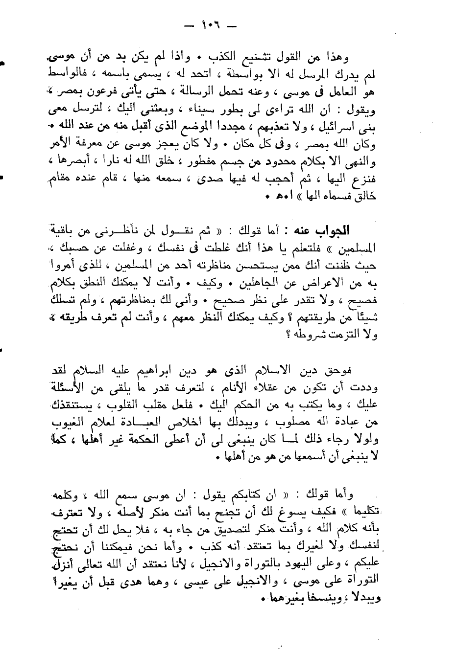 وَأما قَوْلك إِن كتابكُمْ يَقُول إِن مُوسَى سمع الله وَكَلمه تكليما فَكيف يسوغ لَك أَن تجنح بِمَا أَنْت مُنكر لأصله وَلَا تعترف بِأَنَّهُ كَلَام الله وَأَنت مُنكر لتصديق من جَاءَ بِهِ فَلَا يحل لَك أَن تحتج لنَفسك وَلَا لغيرك بِمَا تعتقد أَنه كذب وَأما نَحن فيمكننا أَن نحتج عَلَيْكُم وعَلى الْيَهُود بِالتَّوْرَاةِ وَالْإِنْجِيل لأَنا نعتقد أَن الله تَعَالَى أنزل التَّوْرَاة على مُوسَى وَالْإِنْجِيل على عِيسَى وهما هدى قبل أَن يغيرا ويبدلا وينسخا بِغَيْرِهِمَا