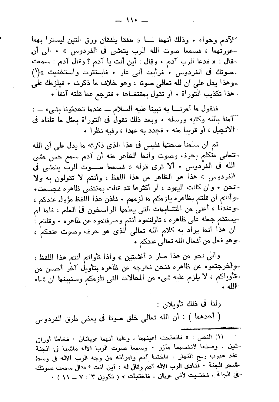 ثمَّ إِن سلمنَا صِحَّتهَا فَلَيْسَ فِي هَذَا الَّذِي ذكرته مَا يدل على أَن الله تَعَالَى مُتَكَلم بِحرف وَصَوت وَإِنَّمَا الظَّاهِر مِنْهُ أَن آدم سمع حس مَشى الله فِي الفردوس أَلا ترى قَوْله فسمعا صَوت الرب يتمشى فِي الفردوس هَذَا هُوَ الظَّاهِر من هَذَا اللَّفْظ وَأَنْتُم لَا تَقولُونَ بِهِ وَلَا نَحن وَإِن كَانَت الْيَهُود أَو أَكْثَرهَا قد قَالَت بِمُقْتَضى ظَاهره فجسمت وَأَنْتُم إِن قُلْتُمْ بِظَاهِرِهِ يلزمكم مَا لَزِمَهُم فَإِذن هَذَا اللَّفْظ مؤول عنْدكُمْ وَعِنْدنَا أعنى من المتشابهات الَّتِي يعلمهَا الراسخون فِي الْعلم فَمَا لم يستقم جعله على ظَاهره تأولتموه أَنْتُم وصرفتموه عَن ظَاهره وقلتم أَن هَذَا إِنَّمَا يُرَاد بِهِ كَلَام الله تَعَالَى الَّذِي هُوَ حرف وَصَوت عنْدكُمْ وَهُوَ فعل من أَفعَال الله تَعَالَى عنْدكُمْ