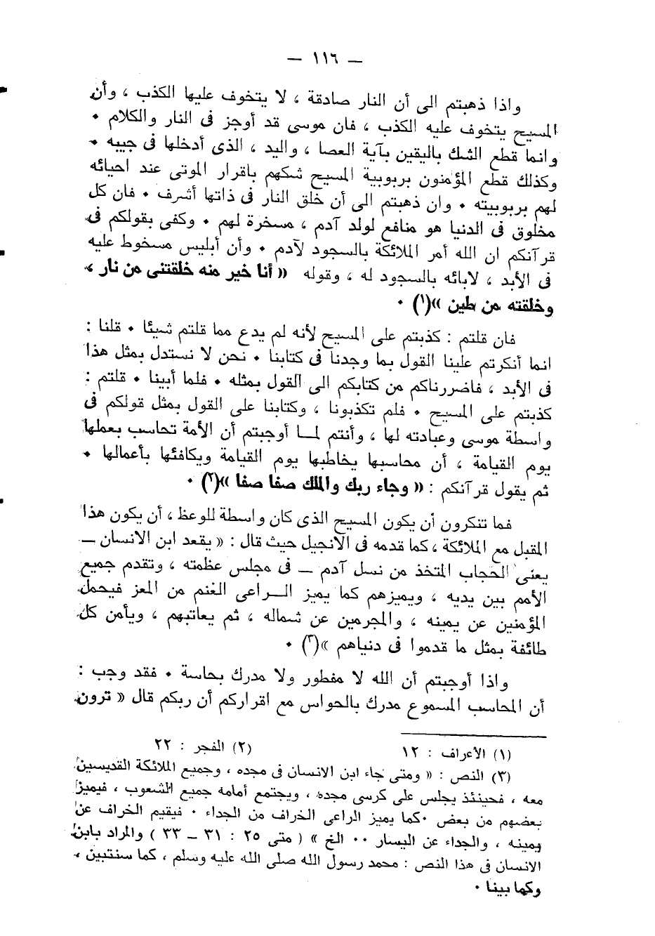 فَإِن قُلْتُمْ كَذبْتُمْ على الْمَسِيح لِأَنَّهُ لم يدع مِمَّا قُلْتُمْ شَيْئا قُلْنَا إِنَّمَا أنكرتم علينا القَوْل بِمَا وجدنَا فِي كتَابنَا نَحن لَا نستدل بِمثل هَذَا فِي الْأَبَد فاضررناكم من كتابكُمْ إِلَى القَوْل بِمثلِهِ فَلَمَّا أَبينَا قُلْتُمْ كَذبْتُمْ على الْمَسِيح فَلم تكذبونا وَكِتَابنَا على القَوْل بِمثل قَوْلكُم فِي وَاسِطَة مُوسَى وعبادته لَهَا وَأَنْتُم لما أوجبتم أَن الْأمة تحاسب بعملها يَوْم الْقِيَامَة أَن محاسبها يخاطبها يَوْم الْقِيَامَة ويكافئها بأعمالها ثمَّ يَقُول قرآنكم {وَجَاء رَبك وَالْملك صفا صفا}