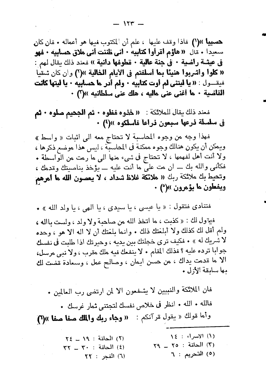 فَإِذا وقف عَلَيْهَا علم أَن الْمَكْتُوب فِيهَا هُوَ أَعماله فَإِن كَانَ سعيدا قَالَ {هاؤم اقرؤوا كِتَابيه إِنِّي ظَنَنْت أَنِّي ملاق حسابيه فَهُوَ فِي عيشة راضية فِي جنَّة عالية قطوفها دانية} فَعِنْدَ ذَلِك يُقَال لَهُم {كلوا وَاشْرَبُوا هَنِيئًا بِمَا أسلفتم فِي الْأَيَّام الخالية} وَإِن كَانَ شقيا فَيَقُول {يَا لَيْتَني لم أوت كِتَابيه وَلم أدر مَا حسابيه يَا ليتها كَانَت القاضية مَا أغْنى عني ماليه هلك عني سلطانيه}