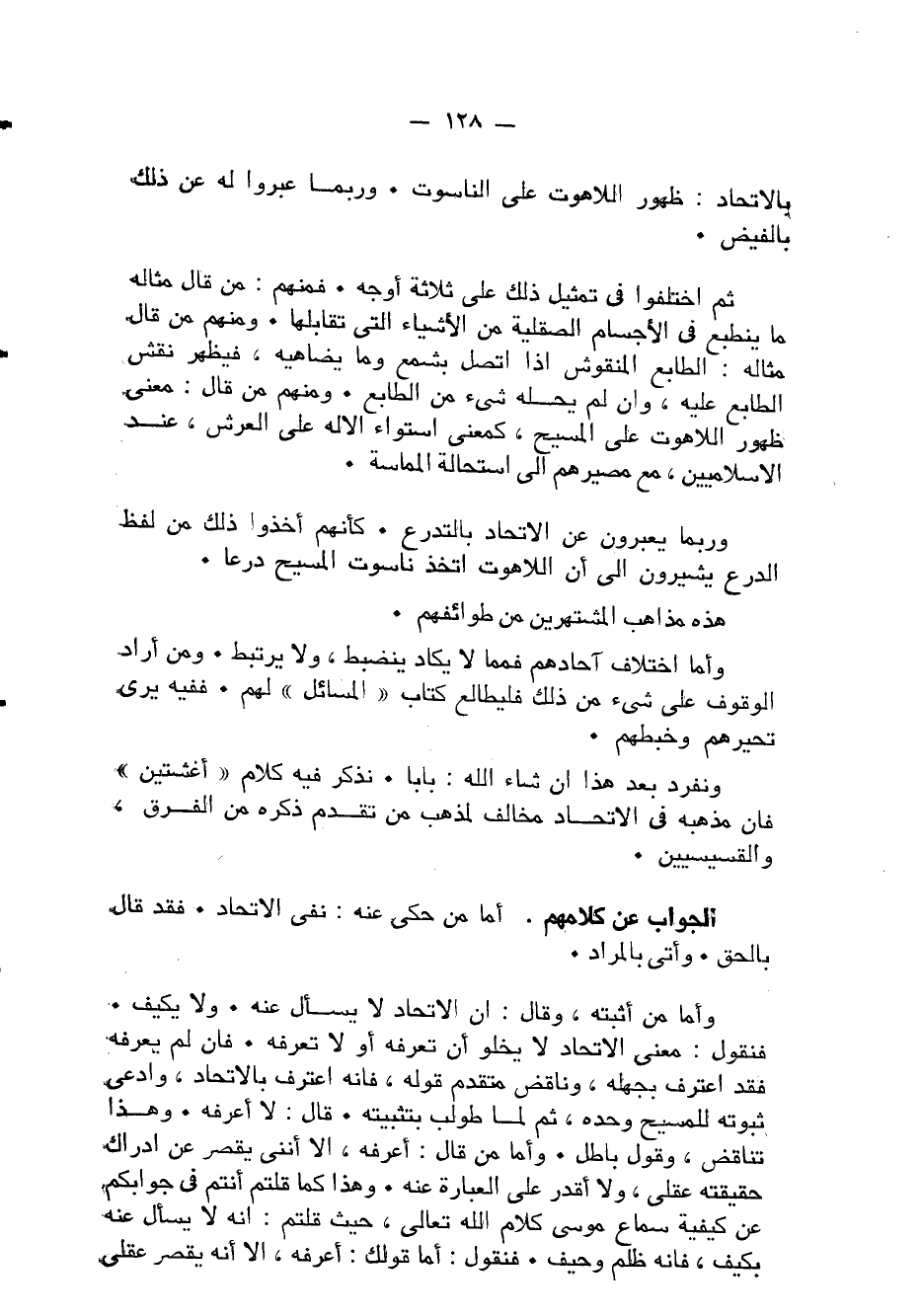 وَأما من أثْبته وَقَالَ إِن الإتحاد لَا يسْأَل عَنهُ وَلَا يكيف فَنَقُول معنى الإتحاد لَا يَخْلُو أَن تعرفه أَو لَا تعرفه فَإِن لم يعرفهُ فقد اعْترف بجهله وناقض مُتَقَدم قَوْله فَإِنَّهُ اعْترف بالإتحاد وَادّعى ثُبُوته للمسيح وَحده ثمَّ لما طُولِبَ بتثبيته قَالَ لَا أعرفهُ وَهَذَا تنَاقض وَقَول بَاطِل وَأما من قَالَ أعرفهُ إِلَّا أنني يقصر عَن إِدْرَاك حَقِيقَته عقلى وَلَا أقدر على الْعبارَة عَنهُ وَهَذَا كَمَا قُلْتُمْ أَنْتُم فِي جوابكم عَن كَيْفيَّة سَماع مُوسَى كَلَام الله تَعَالَى حَيْثُ قُلْتُمْ أَنه لَا يسْأَل عَنهُ بكيف فَإِنَّهُ ظلم وحيف فَنَقُول أما قَوْلك أعرفهُ إِلَّا أَنه يقصر عقلى