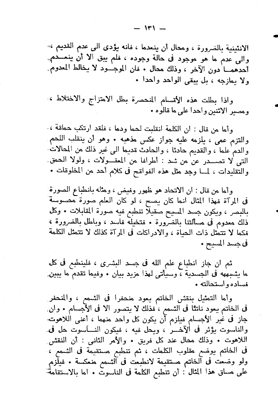 وَأما من قَالَ إِن الإتحاد هُوَ ظُهُور وفيض وَمثله بانطباع الصُّور فِي الْمرْآة فَهَذَا الْمِثَال إِنَّمَا كَانَ يَصح لَو كَانَ الْعلم صُورَة محسوسة بالبصر وَيكون جَسَد الْمَسِيح صقيلا تنطبع فِيهِ صُورَة المقابلات وكل ذَلِك مَعْدُوم فِي مَسْأَلَتنَا بِالضَّرُورَةِ فتخيله فَاسد وباطل بِالضَّرُورَةِ فَكَمَا لَا تتمثل ذَات الْحَيَاة والإدراكات فِي الْمرْآة كَذَلِك لَا تتمثل الْكَلِمَة فِي جَسَد الْمَسِيح