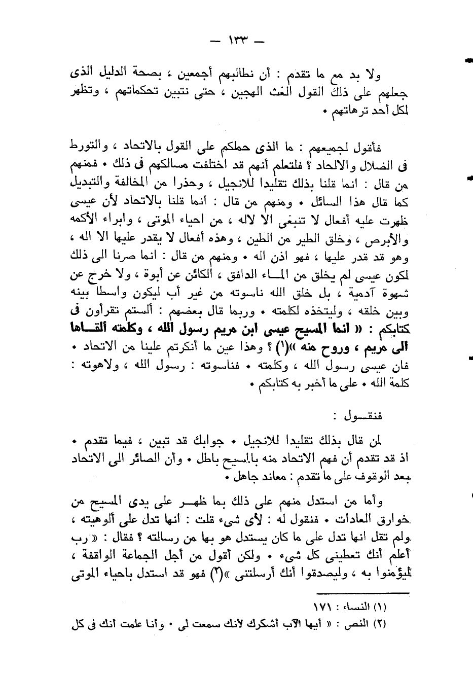 لمن قَالَ بذلك تقليدا للإنجيل جوابك قد تبين فِيمَا تقدم إِذْ قد تقدم أَن فهم الإتحاد مِنْهُ بالمسيح بَاطِل وَأَن الصائر إِلَى الإتحاد بعد الْوُقُوف على مَا تقدم معاند جَاهِل