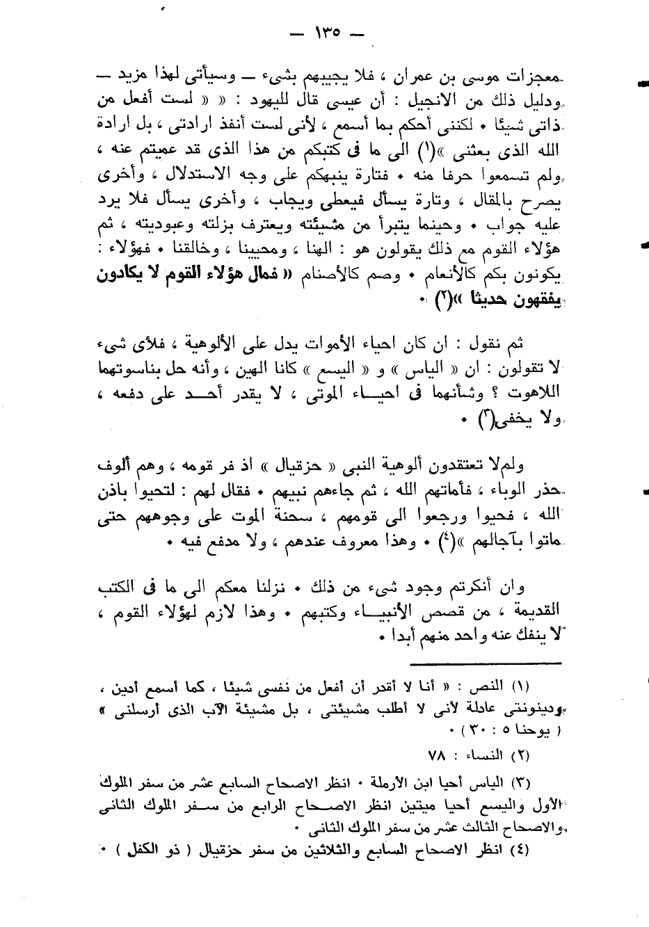 معجزات مُوسَى بن عمرَان فَلَا يُجِيبهُمْ بِشَيْء وَسَيَأْتِي لهَذَا مزِيد وَدَلِيل ذَلِك من الْإِنْجِيل أَن عِيسَى قَالَ للْيَهُود لست أفعل من ذاتي شَيْئا لكنني أحكم بِمَا أسمع لِأَنِّي لست أنفذ إرادتي بل إِرَادَة الله الَّذِي بَعَثَنِي إِلَى مَا فِي كتبكم من هَذَا الَّذِي قد عميتم عَنهُ وَلم تسمعوا حرفا مِنْهُ فَتَارَة ينبهكم على وَجه الإستدلال وَأُخْرَى يُصَرح بالمقال وَتارَة يسْأَل فَيعْطى وَيُجَاب وَأُخْرَى يسْأَل فَلَا يرد عَلَيْهِ جَوَاب وحينما يتبرأ من مَشِيئَته ويعترف بزلته وعبوديته ثمَّ هَؤُلَاءِ الْقَوْم مَعَ ذَلِك يَقُولُونَ هُوَ إلهنا ومحيينا وخالقنا فَهَؤُلَاءِ يكونُونَ بكم كالأنعام وصم كالأصنام {فَمَا لهَؤُلَاء الْقَوْم لَا يكادون يفقهُونَ حَدِيثا}