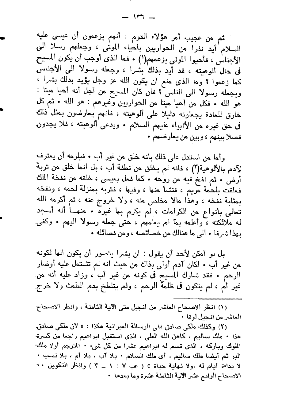 ثمَّ من عَجِيب أَمر هَؤُلَاءِ الْقَوْم أَنهم يَزْعمُونَ أَن عِيسَى عَلَيْهِ السَّلَام أيد نَفرا من الحواريين بإحياء الْمَوْتَى وجعلهم رسلًا إِلَى الْأَجْنَاس فأحيوا الْمَوْتَى بزعمهم فَمَا الَّذِي أوجب أَن يكون الْمَسِيح فِي حَال ألوهيته قد أيد بذلك بشرا وَجعله رَسُولا إِلَى الْأَجْنَاس كَمَا زَعَمُوا وَمَا الَّذِي منع أَن يكون الله عز وَجل يُؤَيّد بذلك بشرا ويجعله رَسُولا إِلَى النَّاس فَإِن كَانَ الْمَسِيح من أجل أَنه أَحْيَا مَيتا هُوَ الله فَكل من أَحْيَا مَيتا من الحواريين وَغَيرهم هُوَ الله ثمَّ كل خارق للْعَادَة يجعلونه دَلِيلا على ألوهيته فَإِنَّهُم يعارضون بِمثل ذَلِك فِي حق غَيره من الْأَنْبِيَاء عَلَيْهِ السَّلَام ويدعى ألوهيته فَلَا يَجدونَ فصلا بَينهم وَبَين من يعارضهم
