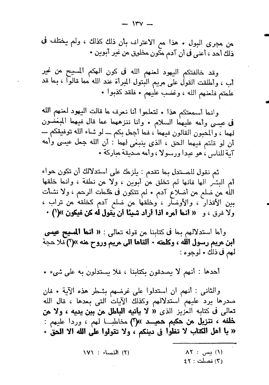 وَأما استدلالهم بِمَا فِي كتَابنَا من قَوْله تَعَالَى {إِنَّمَا الْمَسِيح عِيسَى ابْن مَرْيَم رَسُول الله وكلمته أَلْقَاهَا إِلَى مَرْيَم وروح مِنْهُ} فَلَا حجَّة لَهُم فِي ذَلِك لوجوه