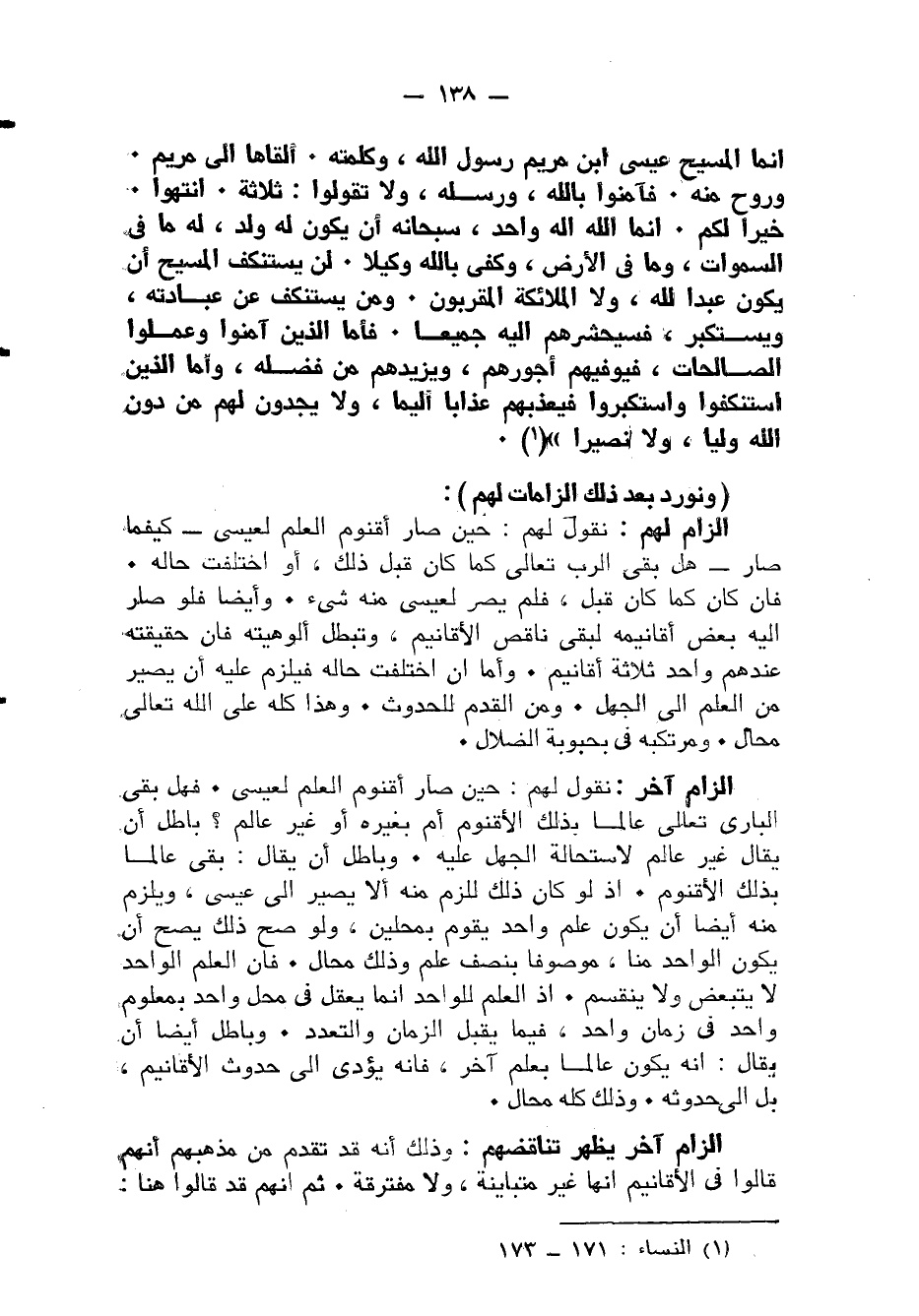 نقُول لَهُم حِين صَار أقنوم الْعلم لعيسى كَيْفَمَا صَار هَل بقى الرب تَعَالَى كَمَا كَانَ قبل ذَلِك أَو اخْتلفت حَاله فَإِن كَانَ كَمَا كَانَ قبل فَلم يصر لعيسى مِنْهُ شَيْء وَأَيْضًا فَلَو صَار إِلَيْهِ بعض أقانيمه لبقى نَاقص الأقانيم وَتبطل ألوهيته فَإِن حَقِيقَته عِنْدهم وَاحِد ثَلَاثَة أقانيم وَأما إِن اخْتلفت حَاله فَيلْزم عَلَيْهِ أَن يصير من الْعلم إِلَى الْجَهْل وَمن الْقدَم للحدوث وَهَذَا كُله على الله تَعَالَى محَال ومرتكبه فِي بحبوبة الضلال