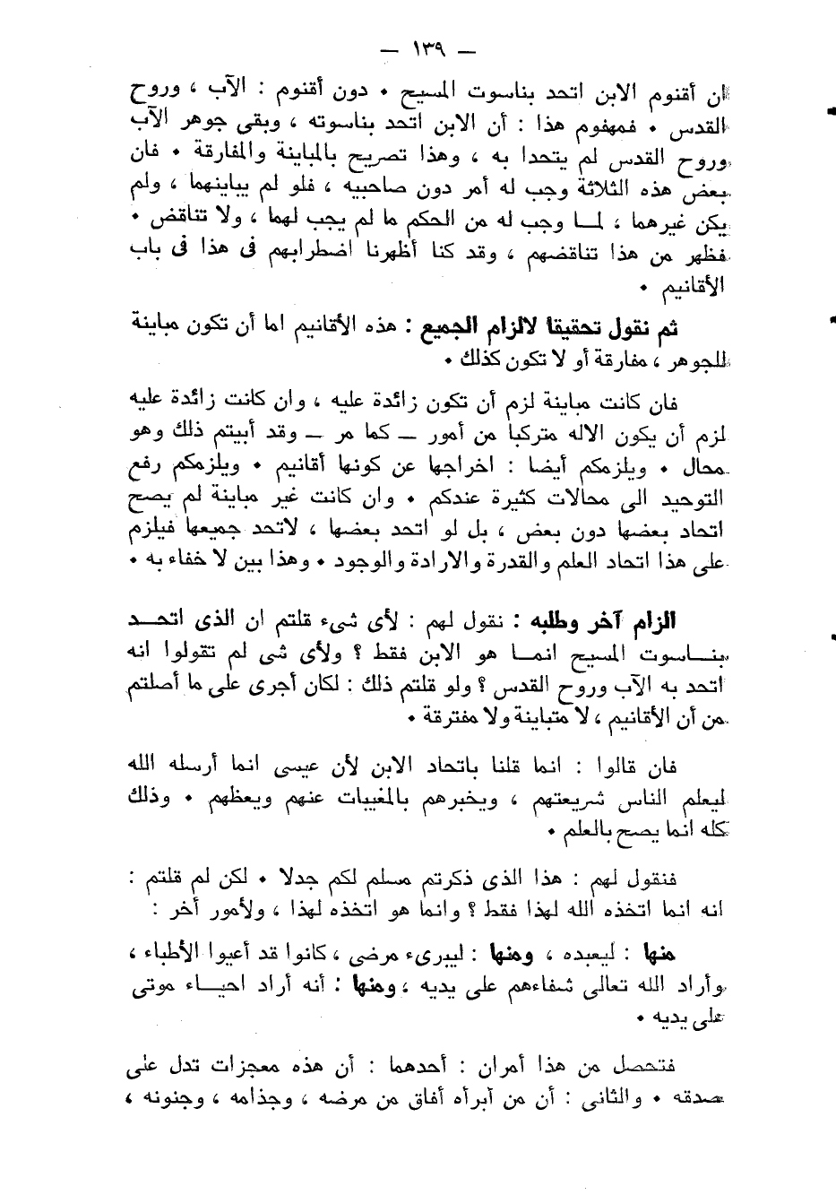 إِن أقنوم الإبن اتَّحد بناسوت الْمَسِيح دون أقنوم الآب وروح الْقُدس فمفهوم هَذَا أَن الإبن اتَّحد بناسوته وبقى جَوْهَر الآب وروح الْقُدس لم يتحدا بِهِ وَهَذَا تَصْرِيح بالمباينة والمفارقة فَإِن بعض هَذِه الثَّلَاثَة وَجب لَهُ أَمر دون صَاحِبيهِ فَلَو لم يباينهما وَلم يكن غَيرهمَا لما وَجب لَهُ من الحكم مَا لم يجب لَهما وَلَا تنَاقض فَظهر من هَذَا تناقضهم وَقد كُنَّا أظهرنَا إضطرابهم فِي هَذَا فِي بَاب الأقانيم